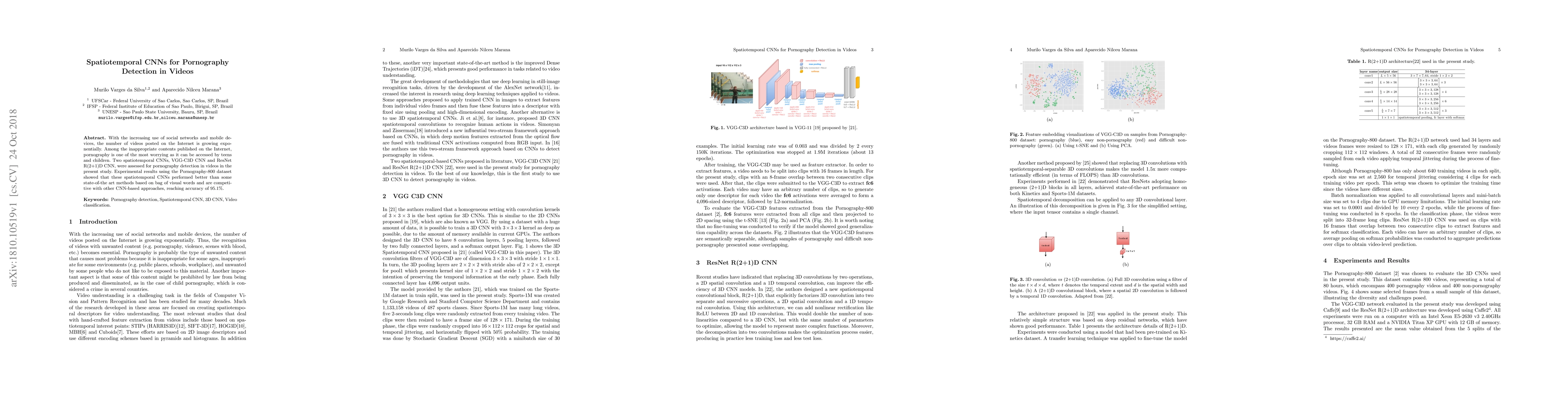 With the increasing use of social networks and mobile devices, the number of videos posted on the Internet is growing exponentially. Among the inappropriate contents published on the Internet, pornography is one of the most worrying as it can be accessed by teens and children. Two spatiotemporal CNNs, VGG-C3D CNN and ResNet R(2+1)D CNN, were assessed for pornography detection in videos in the present study. Experimental results using the Pornography-800 dataset showed that these spatiotemporal CNNs performed better than some state-of-the-art methods based on bag of visual words and are competitive with other CNN-based approaches, reaching accuracy of 95.1%.