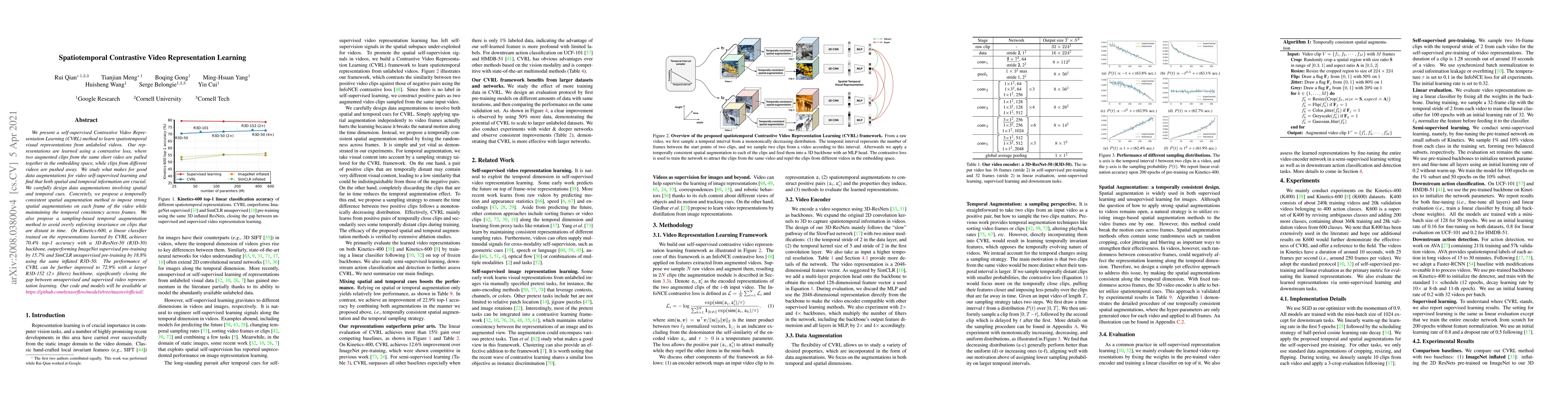 This paper introduces a self-supervised Contrastive Video Representation Learning (CVRL) method that leverages contrastive loss to extract spatiotemporal visual features from unlabeled videos. The method employs carefully designed spatial and temporal data augmentations to enhance learning, achieving superior performance on Kinetics-600 compared to supervised and other unsupervised pre-training methods.