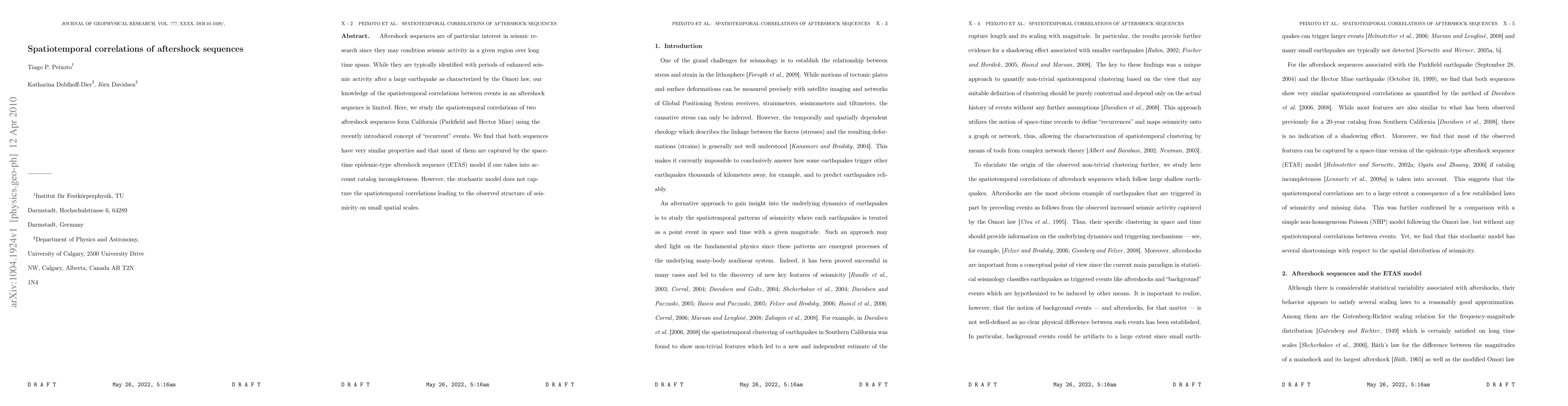 This study investigates spatiotemporal correlations in two California aftershock sequences (Parkfield and Hector Mine) using the "recurrent" events concept. Both sequences exhibit similar properties captured by the ETAS model, but the model fails to account for observed seismicity structures on small spatial scales.