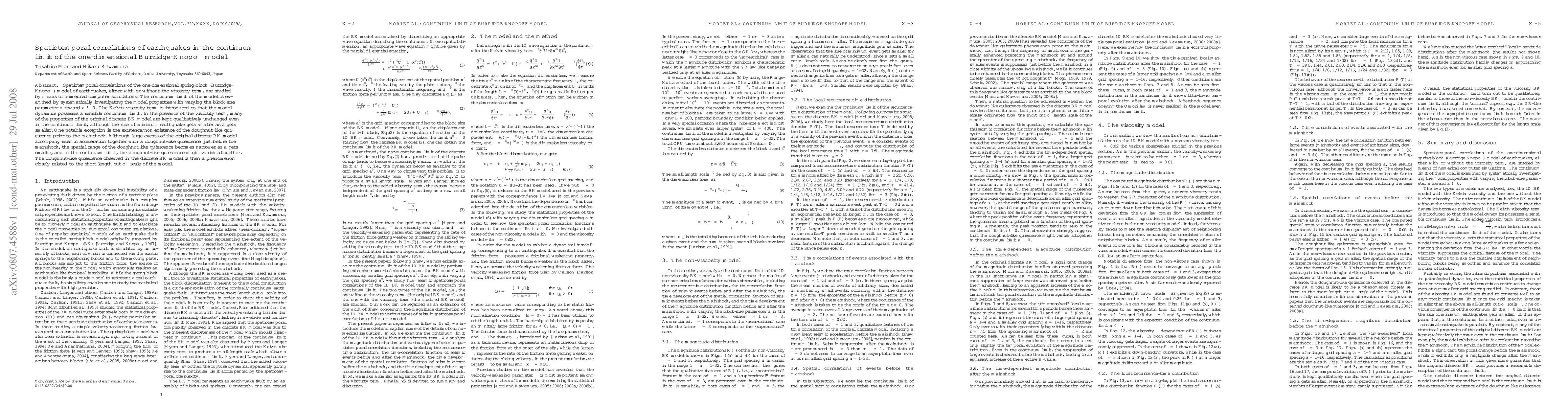 This paper investigates the spatiotemporal correlations of earthquakes in the continuum limit of the one-dimensional Burridge-Knopoff model through numerical simulations. It finds that while many properties remain unchanged in the continuum limit, the doughnut-like quiescence observed in the discrete model may vanish as the block-size parameter approaches zero.