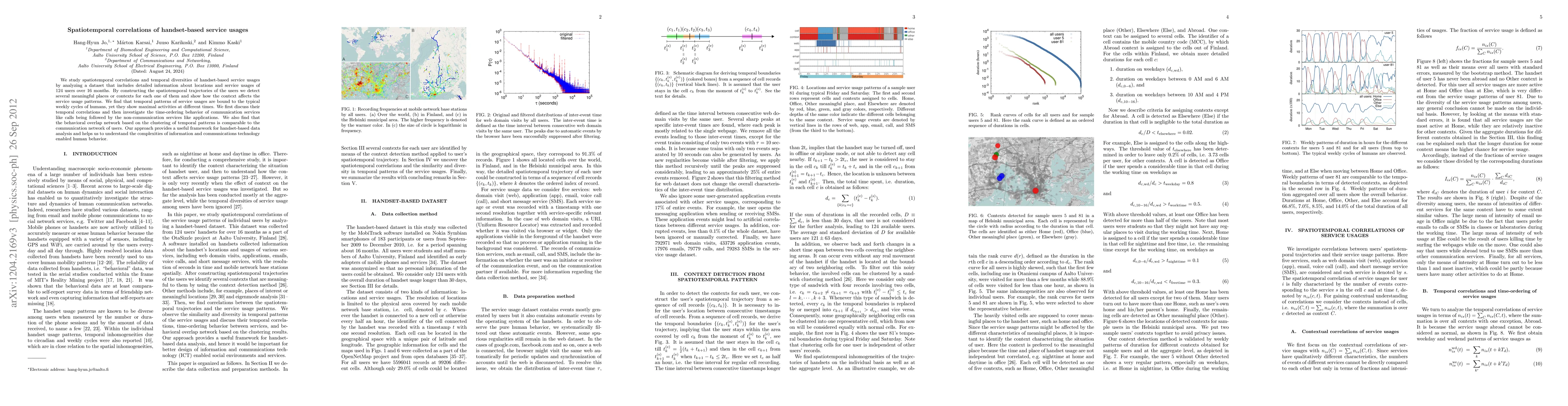 We study spatiotemporal correlations and temporal diversities of handset-based service usages by analyzing a dataset that includes detailed information about locations and service usages of 124 users over 16 months. By constructing the spatiotemporal trajectories of the users we detect several meaningful places or contexts for each one of them and show how the context affects the service usage patterns. We find that temporal patterns of service usages are bound to the typical weekly cycles of humans, yet they show maximal activities at different times. We first discuss their temporal correlations and then investigate the time-ordering behavior of communication services like calls being followed by the non-communication services like applications. We also find that the behavioral overlap network based on the clustering of temporal patterns is comparable to the communication network of users. Our approach provides a useful framework for handset-based data analysis and helps us to understand the complexities of information and communications technology enabled human behavior.