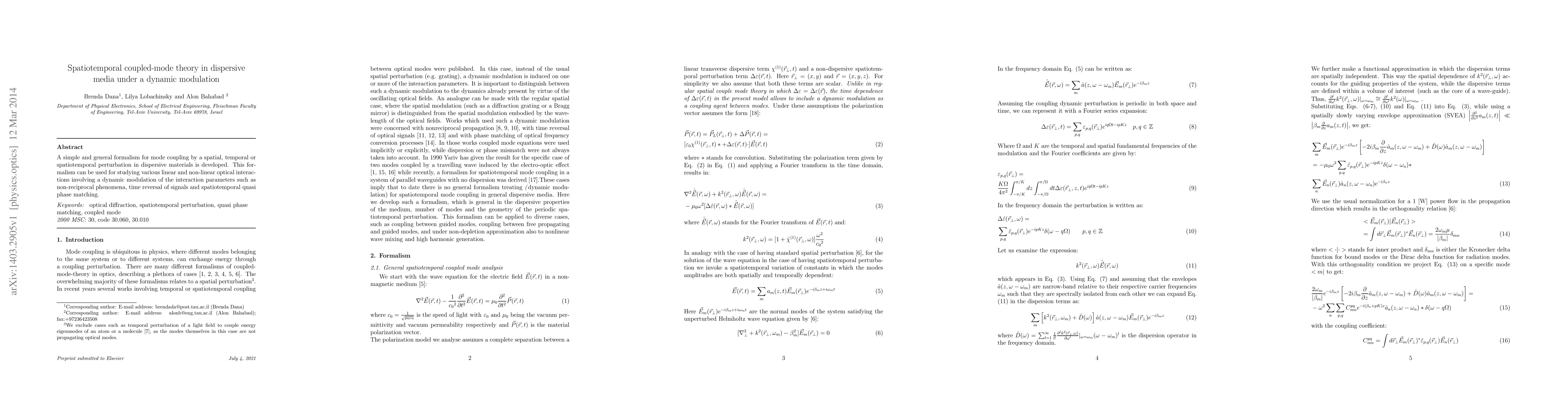A simple and general formalism for mode coupling by a spatial, temporal or spatiotemporal perturbation in dispersive materials is developed. This formalism can be used for studying various linear and non-linear optical interactions involving a dynamic modulation of the interaction parameters such as non-reciprocal phenomena, time reversal of signals and spatiotemporal quasi phase matching