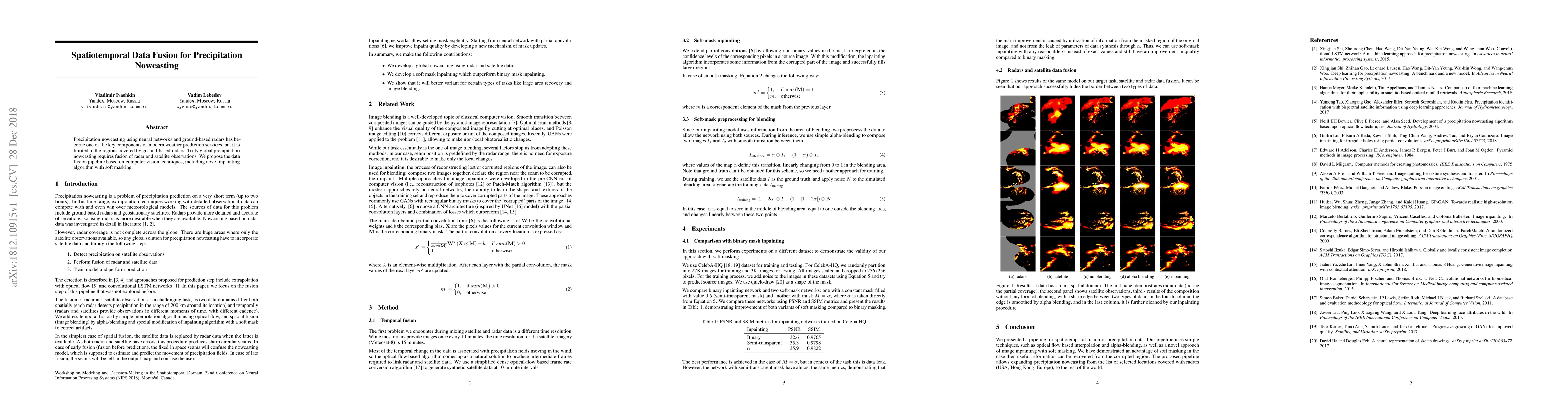 Precipitation nowcasting using neural networks and ground-based radars has become one of the key components of modern weather prediction services, but it is limited to the regions covered by ground-based radars. Truly global precipitation nowcasting requires fusion of radar and satellite observations. We propose the data fusion pipeline based on computer vision techniques, including novel inpainting algorithm with soft masking.