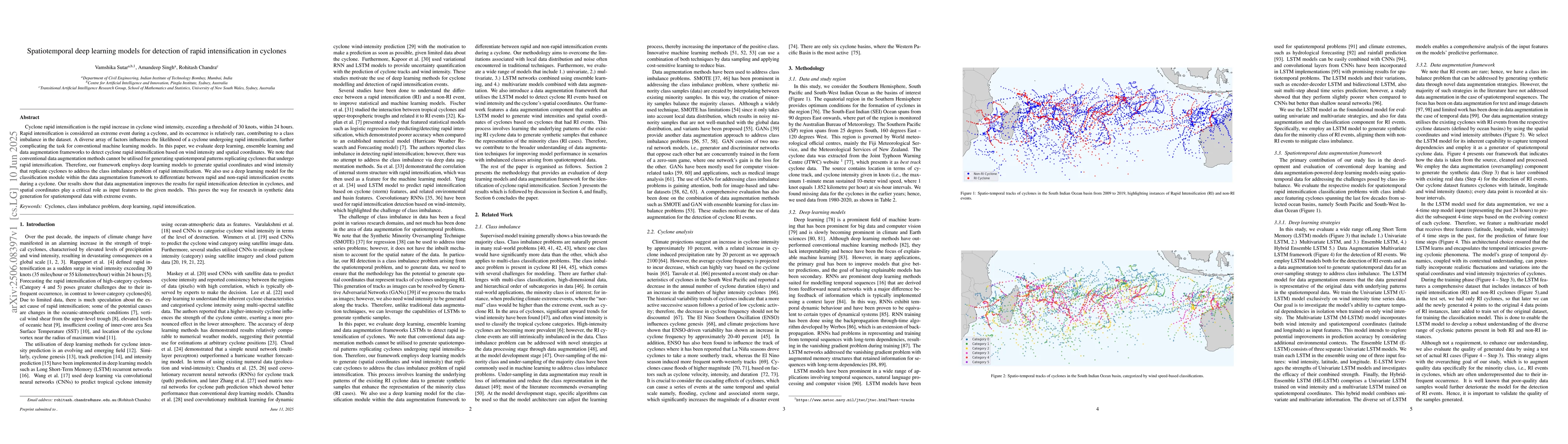 Cyclone rapid intensification is the rapid increase in cyclone wind intensity, exceeding a threshold of 30 knots, within 24 hours. Rapid intensification is considered an extreme event during a cyclone, and its occurrence is relatively rare, contributing to a class imbalance in the dataset. A diverse array of factors influences the likelihood of a cyclone undergoing rapid intensification, further complicating the task for conventional machine learning models. In this paper, we evaluate deep learning, ensemble learning and data augmentation frameworks to detect cyclone rapid intensification based on wind intensity and spatial coordinates. We note that conventional data augmentation methods cannot be utilised for generating spatiotemporal patterns replicating cyclones that undergo rapid intensification. Therefore, our framework employs deep learning models to generate spatial coordinates and wind intensity that replicate cyclones to address the class imbalance problem of rapid intensification. We also use a deep learning model for the classification module within the data augmentation framework to differentiate between rapid and non-rapid intensification events during a cyclone. Our results show that data augmentation improves the results for rapid intensification detection in cyclones, and spatial coordinates play a critical role as input features to the given models. This paves the way for research in synthetic data generation for spatiotemporal data with extreme events.