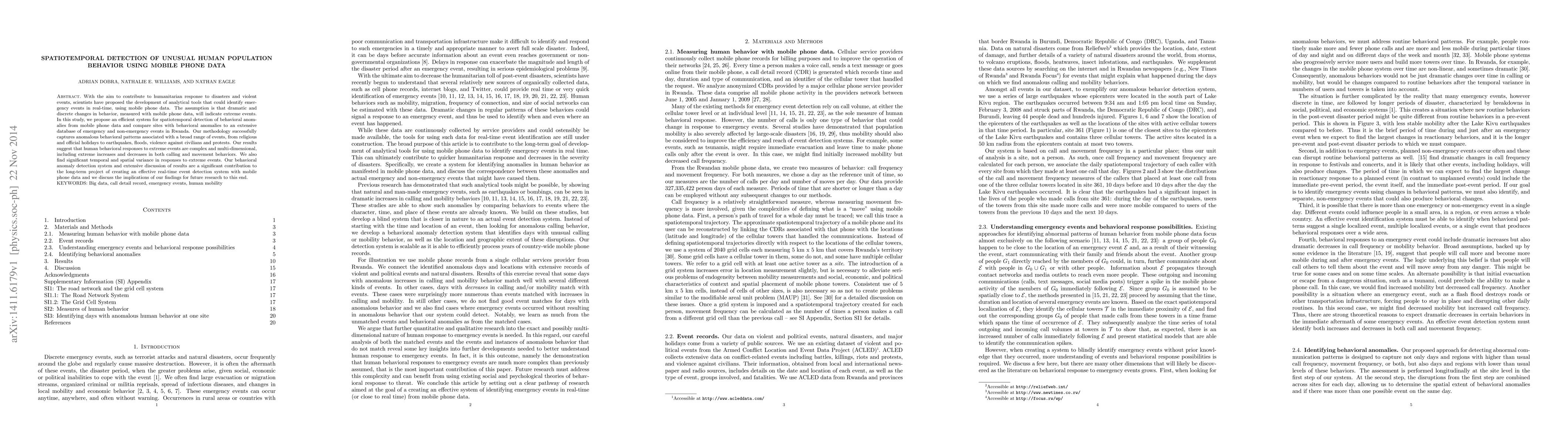 This study develops a system for detecting unusual human population behavior using mobile phone data to identify emergency events in real-time. The system successfully captures complex behavioral anomalies associated with various events, highlighting significant temporal and spatial variance in human responses to extreme occurrences.