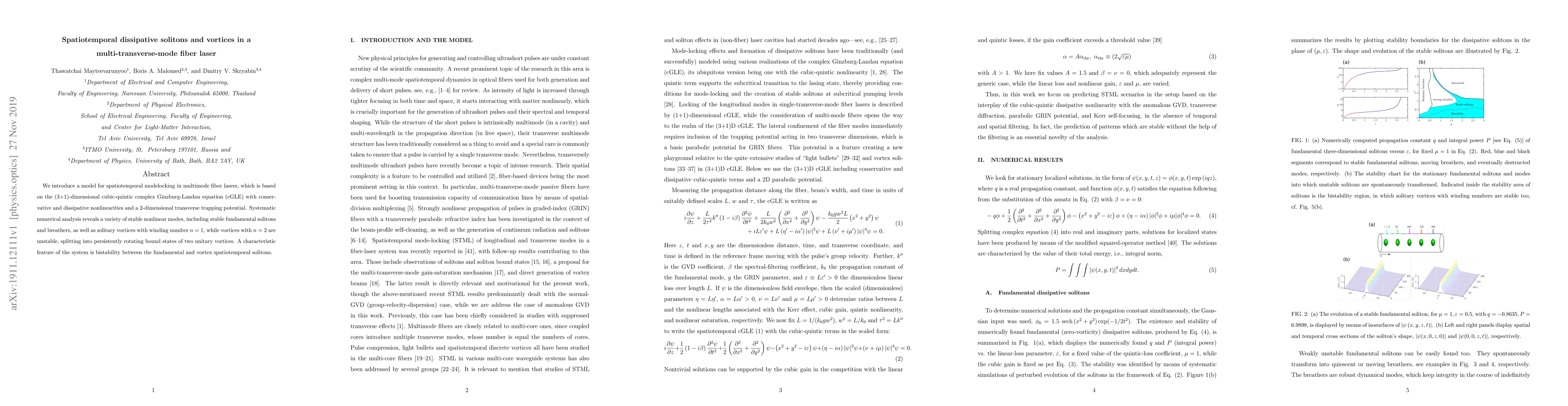 This paper models spatiotemporal modelocking in multimode fiber lasers using a (3+1)-dimensional cubic-quintic complex Ginzburg-Landau equation, revealing stable solitons, breathers, and solitary vortices, with bistability between fundamental and vortex solitons. Vortices with winding number $n=2$ are unstable, splitting into two unitary vortices.