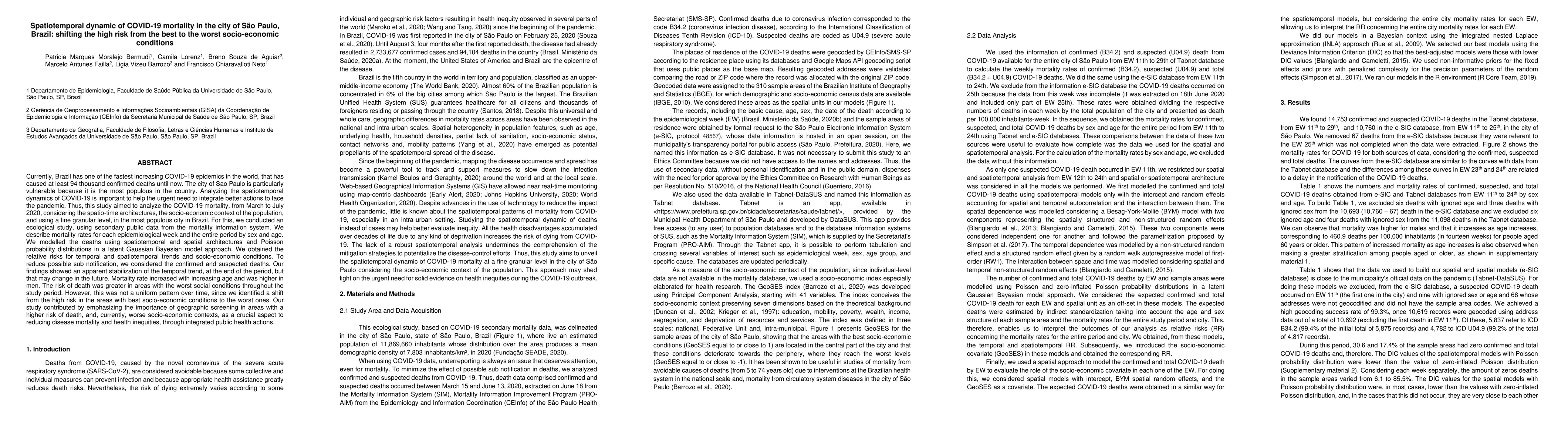 This study analyzes the spatiotemporal dynamics of COVID-19 mortality in Sao Paulo, Brazil, from March to July 2020, revealing a shift in high-risk areas from better to worse socio-economic conditions. The research emphasizes the importance of geographic screening to reduce mortality and health inequities through integrated public health actions.
