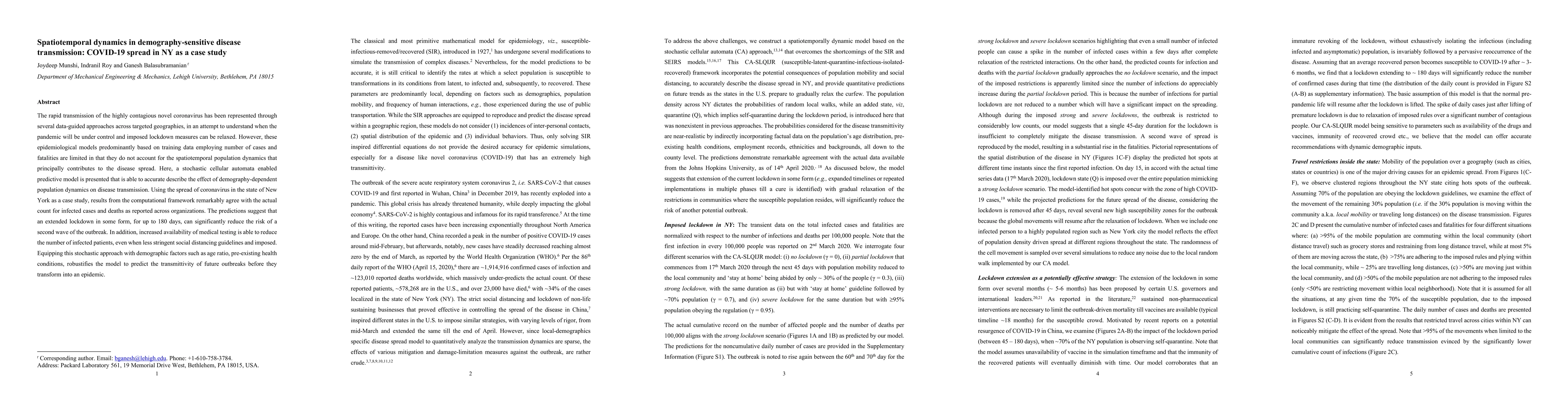 The rapid transmission of the highly contagious novel coronavirus has been represented through several data-guided approaches across targeted geographies, in an attempt to understand when the pandemic will be under control and imposed lockdown measures can be relaxed. However, these epidemiological models predominantly based on training data employing number of cases and fatalities are limited in that they do not account for the spatiotemporal population dynamics that principally contributes to the disease spread. Here, a stochastic cellular automata enabled predictive model is presented that is able to accurate describe the effect of demography-dependent population dynamics on disease transmission. Using the spread of coronavirus in the state of New York as a case study, results from the computational framework remarkably agree with the actual count for infected cases and deaths as reported across organizations. The predictions suggest that an extended lockdown in some form, for up to 180 days, can significantly reduce the risk of a second wave of the outbreak. In addition, increased availability of medical testing is able to reduce the number of infected patients, even when less stringent social distancing guidelines and imposed. Equipping this stochastic approach with demographic factors such as age ratio, pre-existing health conditions, robustifies the model to predict the transmittivity of future outbreaks before they transform into an epidemic.