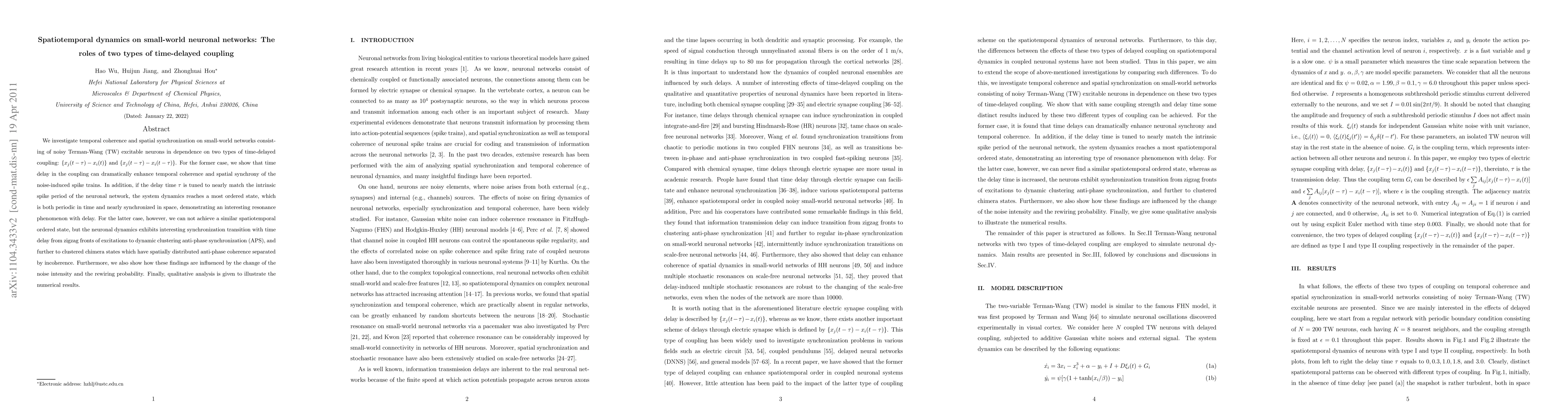 We investigate temporal coherence and spatial synchronization on small-world networks consisting of noisy Terman-Wang (TW) excitable neurons in dependence on two types of time-delayed coupling: $\{x_j(t-\tau)-x_i (t)\}$ and $\{x_j(t-\tau)-x_i(t-\tau)\}$. For the former case, we show that time delay in the coupling can dramatically enhance temporal coherence and spatial synchrony of the noise-induced spike trains. In addition, if the delay time $\tau$ is tuned to nearly match the intrinsic spike period of the neuronal network, the system dynamics reaches a most ordered state, which is both periodic in time and nearly synchronized in space, demonstrating an interesting resonance phenomenon with delay. For the latter case, however, we can not achieve a similar spatiotemporal ordered state, but the neuronal dynamics exhibits interesting synchronization transition with time delay from zigzag fronts of excitations to dynamic clustering anti-phase synchronization (APS), and further to clustered chimera states which have spatially distributed anti-phase coherence separated by incoherence. Furthermore, we also show how these findings are influenced by the change of the noise intensity and the rewiring probability. Finally, qualitative analysis is given to illustrate the numerical results.