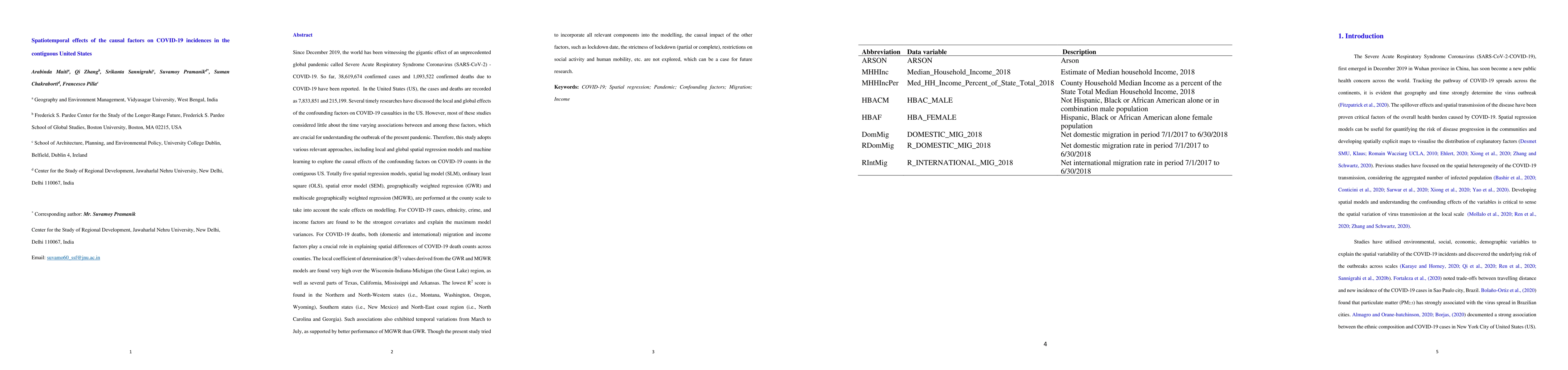 Since December 2019, the world has been witnessing the gigantic effect of an unprecedented global pandemic called Severe Acute Respiratory Syndrome Coronavirus (SARS-CoV-2) - COVID-19. So far, 38,619,674 confirmed cases and 1,093,522 confirmed deaths due to COVID-19 have been reported. In the United States (US), the cases and deaths are recorded as 7,833,851 and 215,199. Several timely researches have discussed the local and global effects of the confounding factors on COVID-19 casualties in the US. However, most of these studies considered little about the time varying associations between and among these factors, which are crucial for understanding the outbreak of the present pandemic. Therefore, this study adopts various relevant approaches, including local and global spatial regression models and machine learning to explore the causal effects of the confounding factors on COVID-19 counts in the contiguous US. Totally five spatial regression models, spatial lag model (SLM), ordinary least square (OLS), spatial error model (SEM), geographically weighted regression (GWR) and multiscale geographically weighted regression (MGWR), are performed at the county scale to take into account the scale effects on modelling. For COVID-19 cases, ethnicity, crime, and income factors are found to be the strongest covariates and explain the maximum model variances. For COVID-19 deaths, both (domestic and international) migration and income factors play a crucial role in explaining spatial differences of COVID-19 death counts across counties. The local coefficient of determination (R2) values derived from the GWR and MGWR models are found very high over the Wisconsin-Indiana-Michigan (the Great Lake) region, as well as several parts of Texas, California, Mississippi and Arkansas.