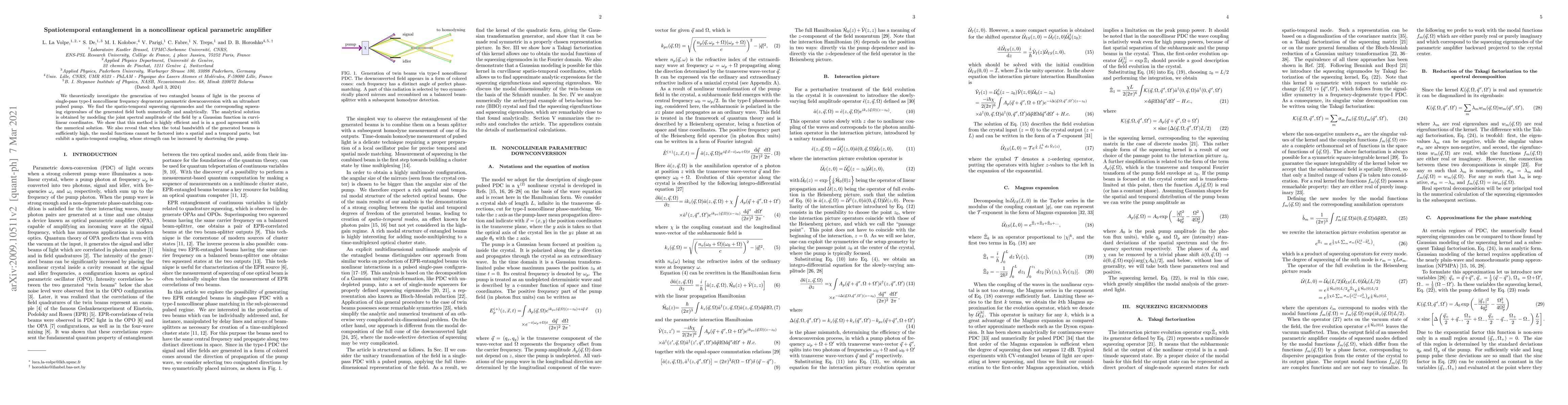 We theoretically investigate the generation of two entangled beams of light in the process of single-pass type-I noncollinear frequency degenerate parametric downconversion with an ultrashort pulsed pump. We find the spatio-temporal squeezing eigenmodes and the corresponding squeezing eigenvalues of the generated field both numerically and analytically. The analytical solution is obtained by modeling the joint spectral amplitude of the field by a Gaussian function in curvilinear coordinates. We show that this method is highly efficient and is in a good agreement with the numerical solution. We also reveal that when the total bandwidth of the generated beams is sufficiently high, the modal functions cannot be factored into a spatial and a temporal parts, but exhibit a spatio-temporal coupling, whose strength can be increased by shortening the pump.
