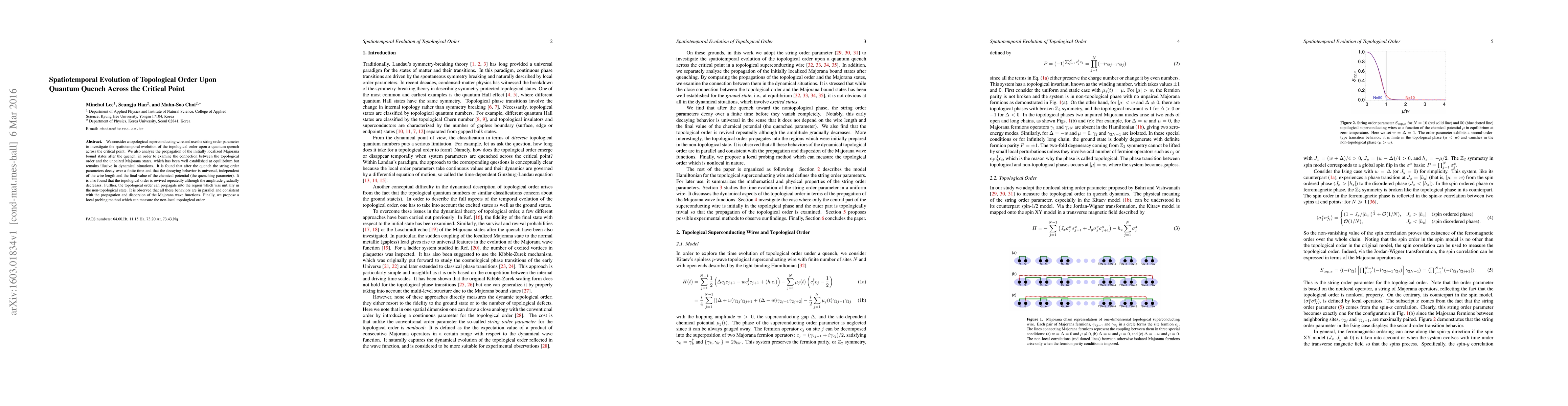 This paper investigates the spatiotemporal evolution of topological order in a superconducting wire after a quantum quench across the critical point, finding universal decay and revival of the string order parameter and propagation of Majorana states. A local probing method is proposed to measure the non-local topological order.