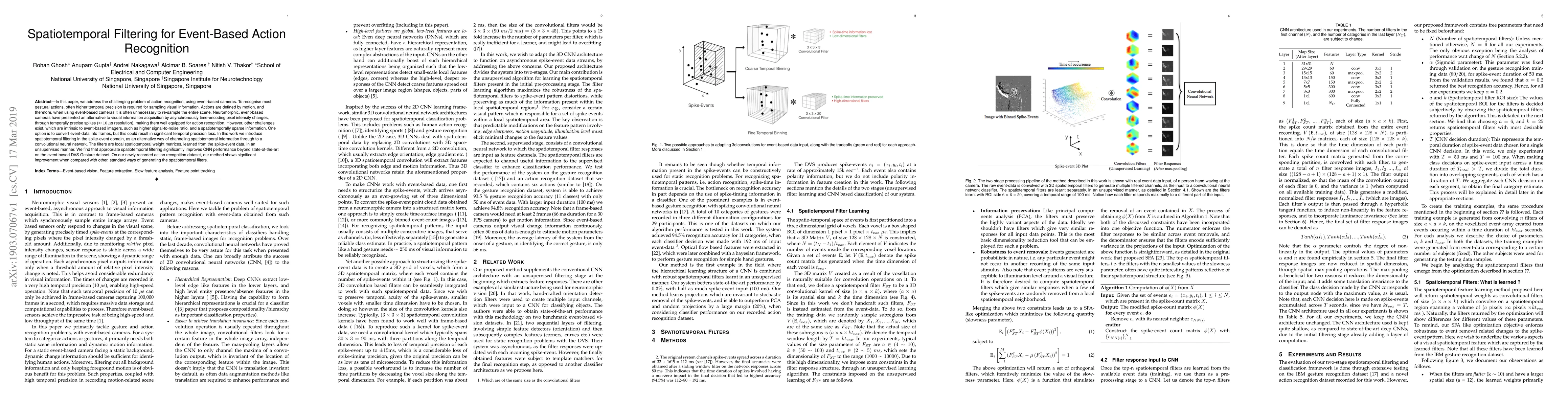 In this paper, we address the challenging problem of action recognition, using event-based cameras. To recognise most gestural actions, often higher temporal precision is required for sampling visual information. Actions are defined by motion, and therefore, when using event-based cameras it is often unnecessary to re-sample the entire scene. Neuromorphic, event-based cameras have presented an alternative to visual information acquisition by asynchronously time-encoding pixel intensity changes, through temporally precise spikes (10 micro-second resolution), making them well equipped for action recognition. However, other challenges exist, which are intrinsic to event-based imagers, such as higher signal-to-noise ratio, and a spatiotemporally sparse information. One option is to convert event-data into frames, but this could result in significant temporal precision loss. In this work we introduce spatiotemporal filtering in the spike-event domain, as an alternative way of channeling spatiotemporal information through to a convolutional neural network. The filters are local spatiotemporal weight matrices, learned from the spike-event data, in an unsupervised manner. We find that appropriate spatiotemporal filtering significantly improves CNN performance beyond state-of-the-art on the event-based DVS Gesture dataset. On our newly recorded action recognition dataset, our method shows significant improvement when compared with other, standard ways of generating the spatiotemporal filters.