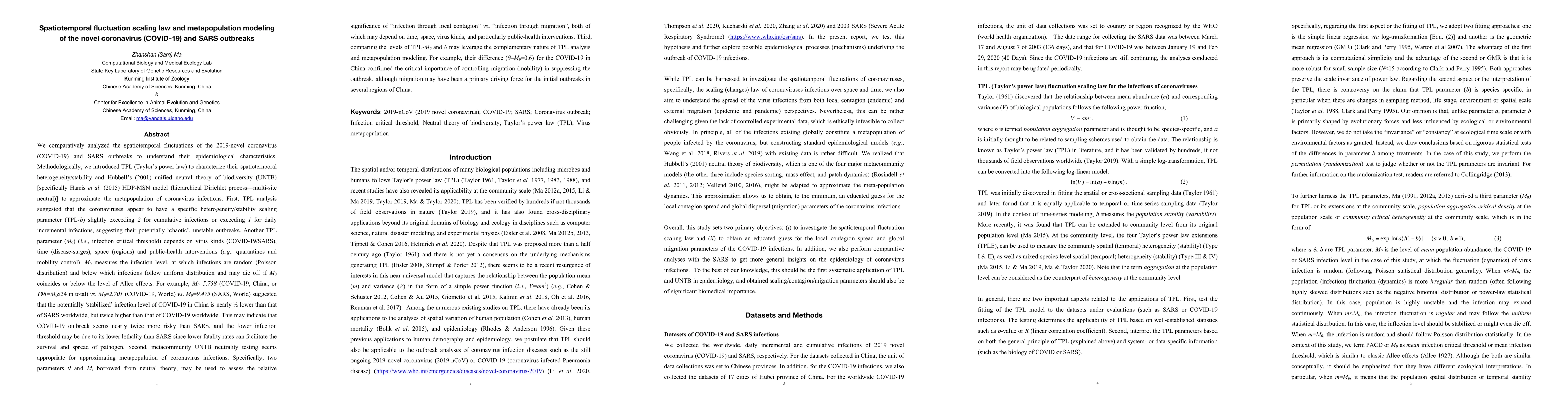 We comparatively analyzed the spatiotemporal fluctuations of the 2019-novel coronavirus (COVID-19) and SARS outbreaks to understand their epidemiological characteristics. Methodologically, we introduced TPL (Taylor power law) to characterize their spatiotemporal heterogeneity/stability and Hubbell (2001) unified neutral theory of biodiversity (UNTB) [specifically Harris et al. (2015) HDP-MSN model (hierarchical Dirichlet process multi-site neutral model)] to approximate the metapopulation of coronavirus infections. First, TPL analysis suggested that the coronaviruses appear to have a specific heterogeneity/stability scaling parameter (TPL-b) slightly exceeding 2 for cumulative infections or exceeding 1 for daily incremental infections, suggesting their potentially chaotic, unstable outbreaks. Another TPL parameter (M0) (i.e., infection critical threshold) depends on virus kinds (COVID-19/SARS), time (disease-stages), space (regions) and public-health interventions (e.g., quarantines and mobility control). M0 measures the infection level, at which infections are random (Poisson distribution) and below which infections follow uniform distribution and may die off if M0 coincides or below the level of Allee effects. It was found that COVID-19 outbreak seems nearly twice more risky than SARS, and the lower infection threshold may be due to its lower lethality than SARS since lower fatality rates can facilitate the survival and spread of pathogen. Second, metacommunity UNTB neutrality testing seems appropriate for approximating metapopulation of coronavirus infections. Specifically, two parameters {\theta} and M, borrowed from neutral theory, may be used to assess the relative significance of infection through local contagion vs. infection through migration, both of which may depend on time, space, virus kinds, and particularly public-health interventions.