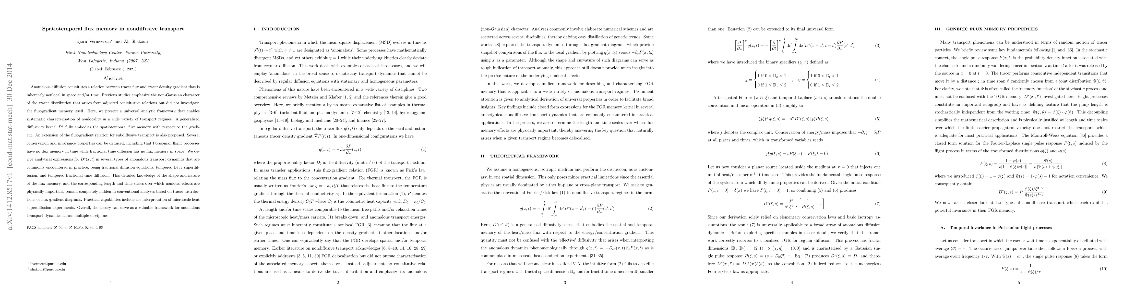 Anomalous diffusion constitutes a relation between tracer flux and tracer density gradient that is inherently nonlocal in space and/or time. Previous studies emphasize the non-Gaussian character of the tracer distribution that arises from adjusted constitutive relations but did not investigate the flux-gradient memory itself. Here, we present a universal analytic framework that enables systematic characterisation of nonlocality in a wide variety of transport regimes. A generalised diffusivity kernel $D^{\ast}$ fully embodies the spatiotemporal flux memory with respect to the gradient. An extension of the flux-gradient relation for subdiffusive transport is also proposed. Several conservation and invariance properties can be deduced, including that Poissonian flight processes have no flux memory in time while fractional time diffusion has no flux memory in space. We derive analytical expressions for $D^{\ast}(x,t)$ in several types of anomalous transport dynamics that are commonly encountered in practice, being fractional diffusion equations, tempered L\'evy superdiffusion, and tempered fractional time diffusion. This detailed knowledge of the shape and nature of the flux memory, and the corresponding length and time scales over which nonlocal effects are physically important, remain completely hidden in conventional analyses based on tracer distributions or flux-gradient diagrams. Practical capabilities include the interpretation of microscale heat superdiffusion experiments. Overall, the theory can serve as a valuable framework for anomalous transport dynamics across multiple disciplines.