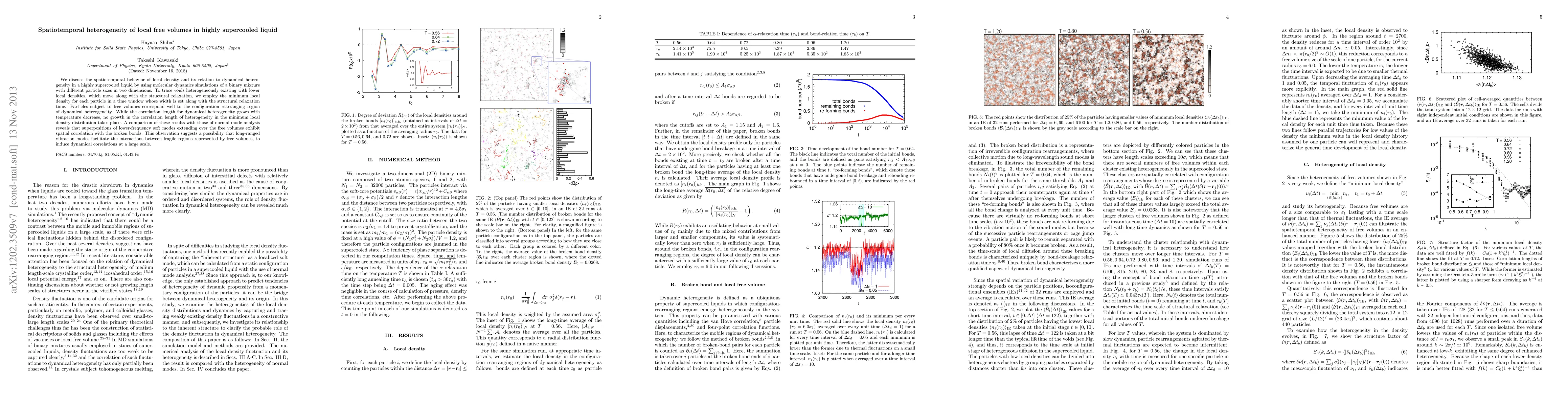 We discuss the spatiotemporal behavior of local density and its relation to dynamical heterogeneity in a highly supercooled liquid by using molecular dynamics simulations of a binary mixture with different particle sizes in two dimensions. To trace voids heterogeneously existing with lower local densities, which move along with the structural relaxation, we employ the minimum local density for each particle in a time window whose width is set along with the structural relaxation time. Particles subject to free volumes correspond well to the configuration rearranging region of dynamical heterogeneity. While the correlation length for dynamical heterogeneity grows with temperature decrease, no growth in the correlation length of heterogeneity in the minimum local density distribution takes place. A comparison of these results with those of normal mode analysis reveals that superpositions of lower-frequency soft modes extending over the free volumes exhibit spatial correlation with the broken bonds. This observation suggests a possibility that long-ranged vibration modes facilitate the interactions between fragile regions represented by free volumes, to induce dynamical correlations at a large scale.