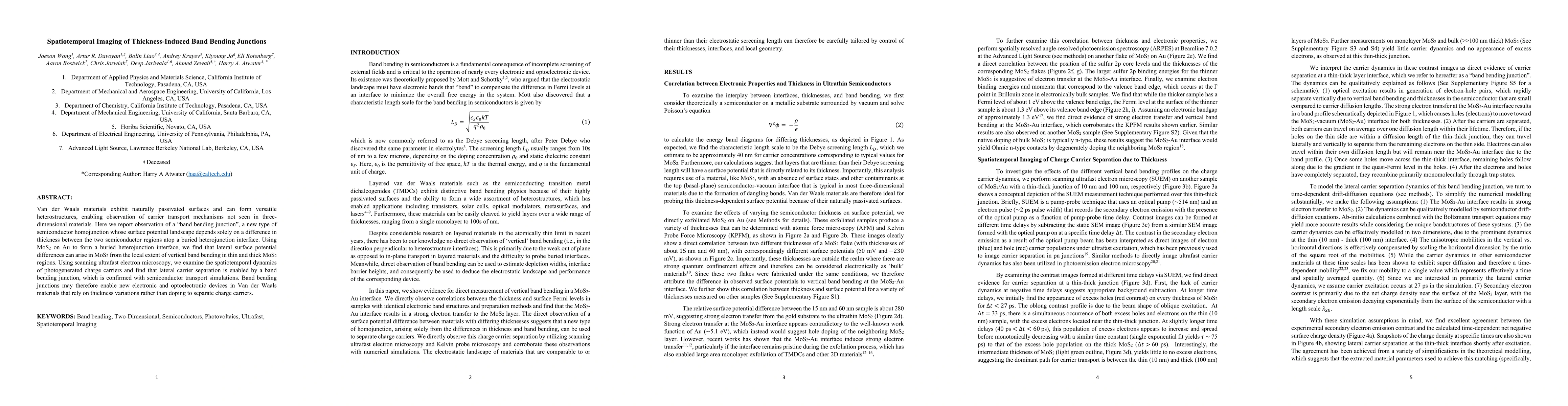 This paper reports the discovery of "band bending junctions" in Van der Waals materials, specifically MoS2 on Au, where surface potential differences arise from thickness variations. Using ultrafast electron microscopy, the study reveals that these junctions enable lateral carrier separation, suggesting potential for novel electronic and optoelectronic devices based on thickness-induced band bending rather than doping.