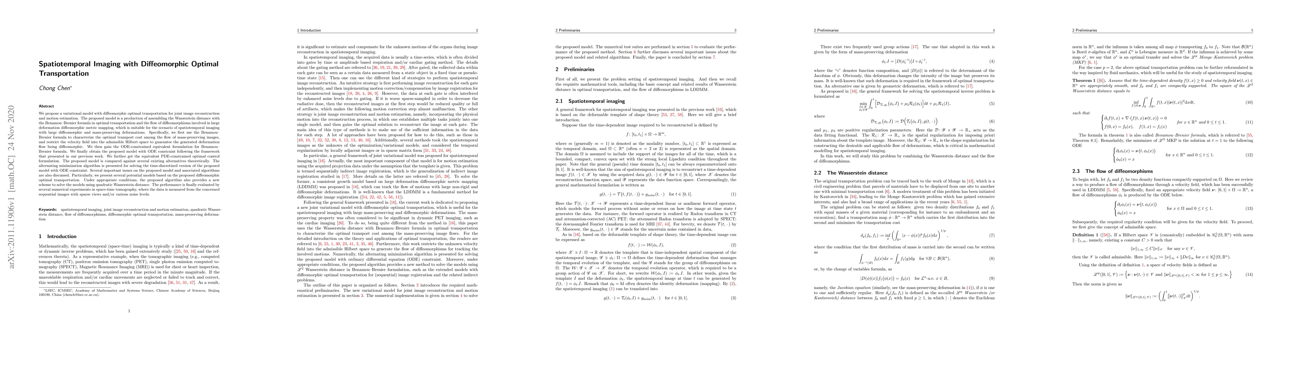 We propose a variational model with diffeomorphic optimal transportation for joint image reconstruction and motion estimation. The proposed model is a production of assembling the Wasserstein distance with the Benamou--Brenier formula in optimal transportation and the flow of diffeomorphisms involved in large deformation diffeomorphic metric mapping, which is suitable for the scenario of spatiotemporal imaging with large diffeomorphic and mass-preserving deformations. Specifically, we first use the Benamou--Brenier formula to characterize the optimal transport cost among the flow of mass-preserving images, and restrict the velocity field into the admissible Hilbert space to guarantee the generated deformation flow being diffeomorphic. We then gain the ODE-constrained equivalent formulation for Benamou--Brenier formula. We finally obtain the proposed model with ODE constraint following the framework that presented in our previous work. We further get the equivalent PDE-constrained optimal control formulation. The proposed model is compared against several existing alternatives theoretically. The alternating minimization algorithm is presented for solving the time-discretized version of the proposed model with ODE constraint. Several important issues on the proposed model and associated algorithms are also discussed. Particularly, we present several potential models based on the proposed diffeomorphic optimal transportation. Under appropriate conditions, the proposed algorithm also provides a new scheme to solve the models using quadratic Wasserstein distance. The performance is finally evaluated by several numerical experiments in space-time tomography, where the data is measured from the concerned sequential images with sparse views and/or various noise levels.