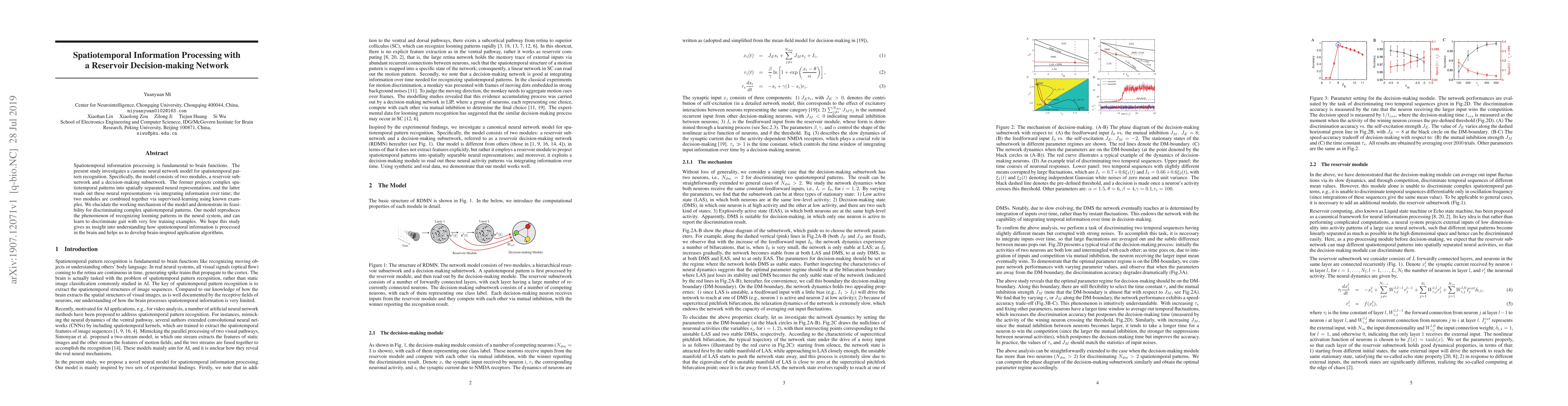 This study proposes a neural network model with a reservoir subnetwork for projecting spatiotemporal patterns and a decision-making subnetwork for temporal integration, demonstrating the model's ability to recognize complex patterns like looming and gait with minimal training. The research aims to provide insights into brain information processing and inspire brain-inspired algorithms.