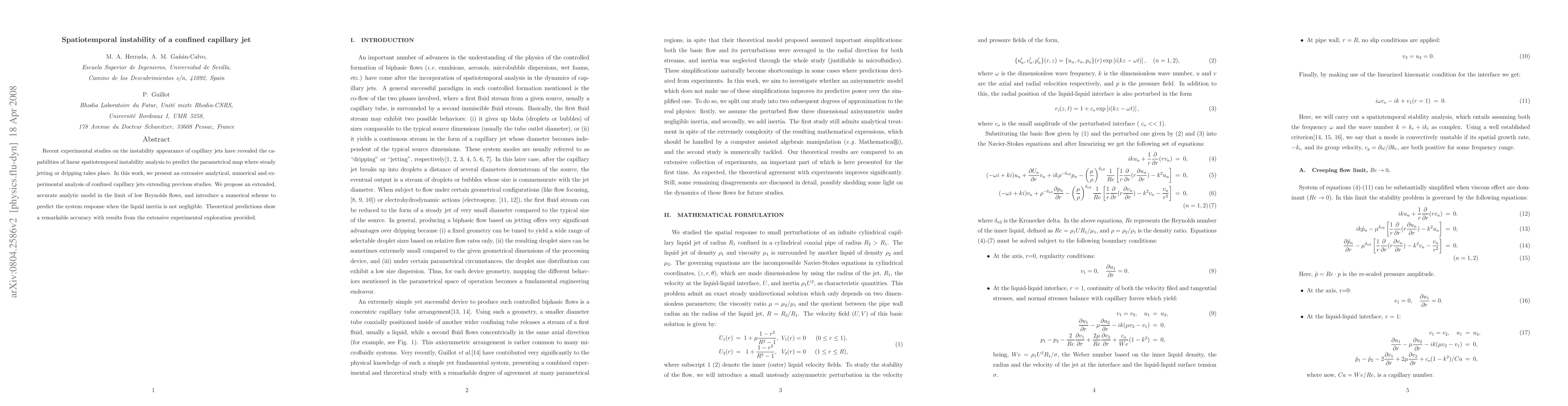 This paper presents an analytical, numerical, and experimental study on the spatiotemporal instability of confined capillary jets, proposing an accurate analytic model for low Reynolds flows and a numerical scheme for higher inertia, with theoretical predictions closely matching experimental results.