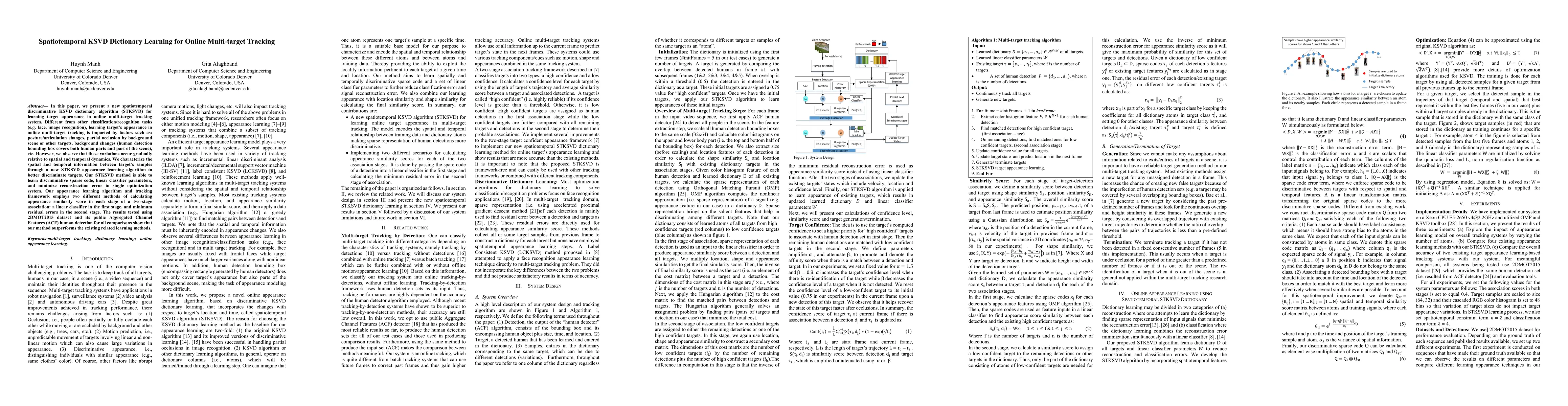 This paper introduces a spatiotemporal KSVD dictionary learning algorithm (STKSVD) for online multi-target tracking, addressing challenges like posture changes and occlusions. The proposed method optimizes spatial and temporal information to better discriminate target appearances, outperforming existing methods on the 2DMOT2015 dataset.