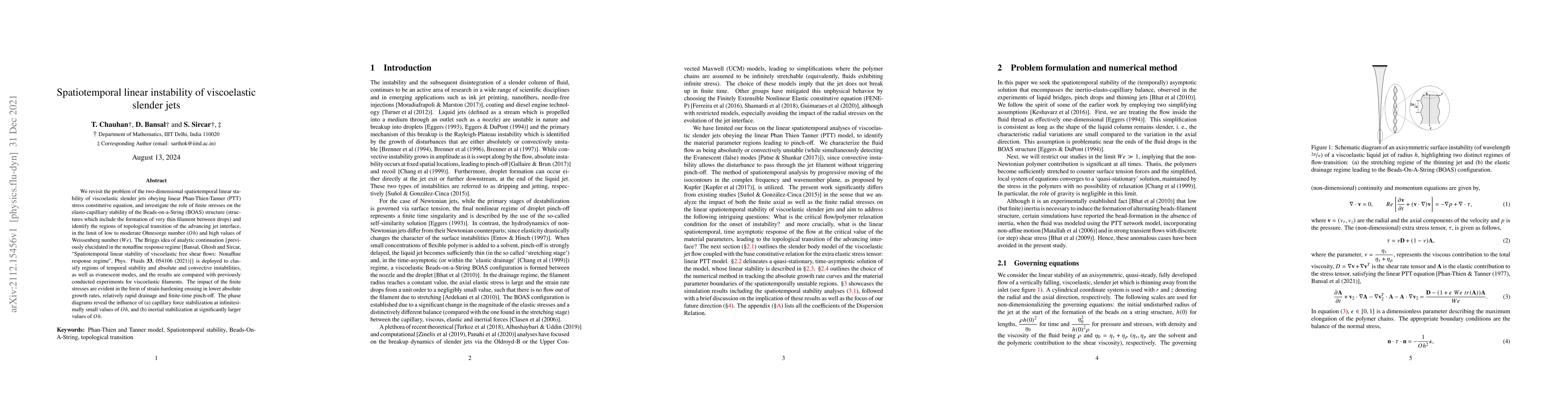 We revisit the problem of the two-dimensional spatiotemporal linear stability of viscoelastic slender jets obeying linear Phan-Thien-Tanner (PTT) stress constitutive equation, and investigate the role of finite stresses on the elasto-capilliary stability of the Beads-on-a-String (BOAS) structure (structures which include the formation of very thin filament between drops) and identify the regions of topological transition of the advancing jet interface, in the limit of low to moderate Ohnesorge number ($Oh$) and high values of Weissenberg number ($We$). The Briggs idea of analytic continuation \{previously elucidated in the nonaffine response regime [Bansal, Ghosh and Sircar, ``Spatiotemporal linear stability of viscoelastic free shear flows: Nonaffine response regime'', Phys. Fluids {\bf 33}, 054106 (2021)]\} is deployed to classify regions of temporal stability and absolute and convective instabilities, as well as evanescent modes, and the results are compared with previously conducted experiments for viscoelastic filaments. The impact of the finite stresses are evident in the form of strain-hardening ensuing in lower absolute growth rates, relatively rapid drainage and finite-time pinch-off. The phase diagrams reveal the influence of (a) capillary force stabilization at infinitesimally small values of $Oh$, and (b) inertial stabilization at significantly larger values of $Oh$.