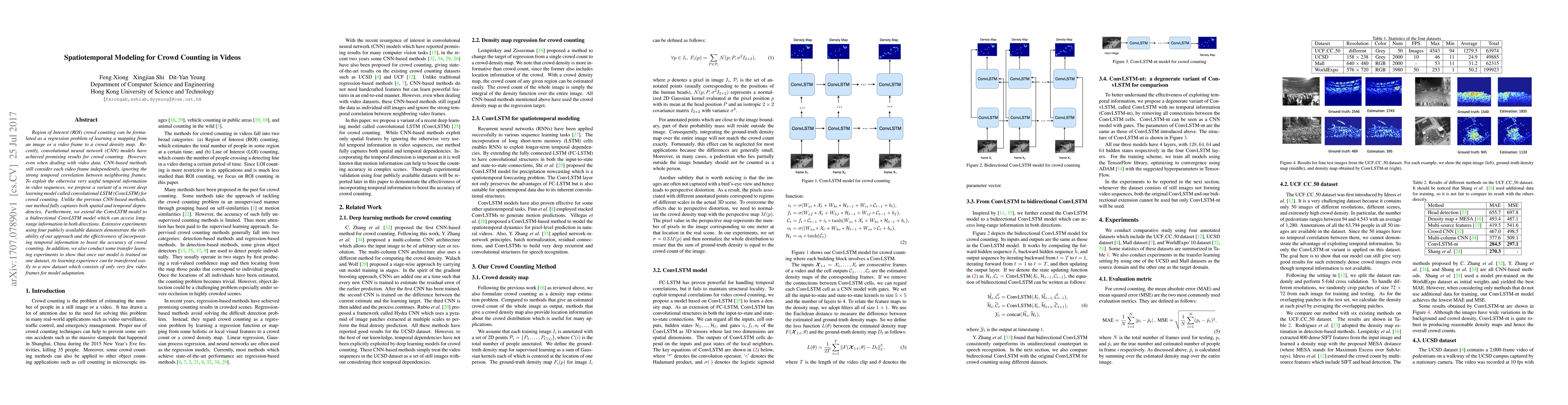 This paper proposes a spatiotemporal modeling approach using a bidirectional convolutional LSTM (ConvLSTM) for crowd counting in videos, capturing both spatial and temporal dependencies to improve accuracy. Experiments show the effectiveness of temporal information and the model's transfer learning capability across different datasets.