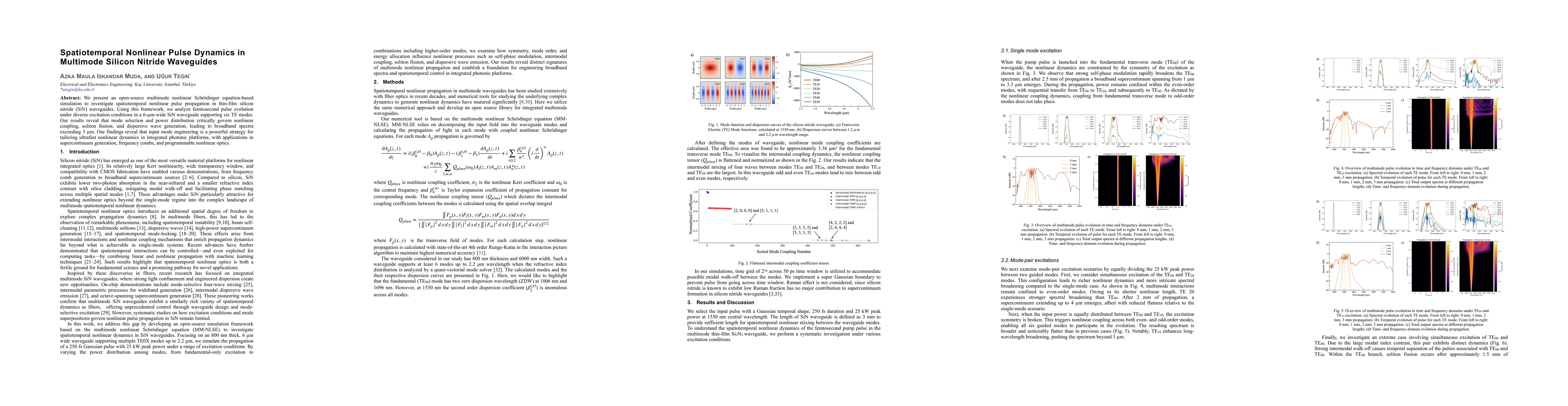 We present an open-source multimode nonlinear Schr\"odinger equation-based simulation to investigate spatiotemporal nonlinear pulse propagation in thin-film silicon nitride (SiN) waveguides. Using this framework, we analyze femtosecond pulse evolution under diverse excitation conditions in a 6 {\mu}m wide SiN waveguide supporting six TE modes. Our results reveal that mode selection and power distribution critically govern nonlinear coupling, soliton fission, and dispersive wave generation, leading to broadband spectra exceeding 3 {\mu}m. Our findings reveal that input mode engineering is a powerful strategy for tailoring ultrafast nonlinear dynamics in integrated photonic platforms, with applications in supercontinuum generation, frequency combs, and programmable nonlinear optics.
