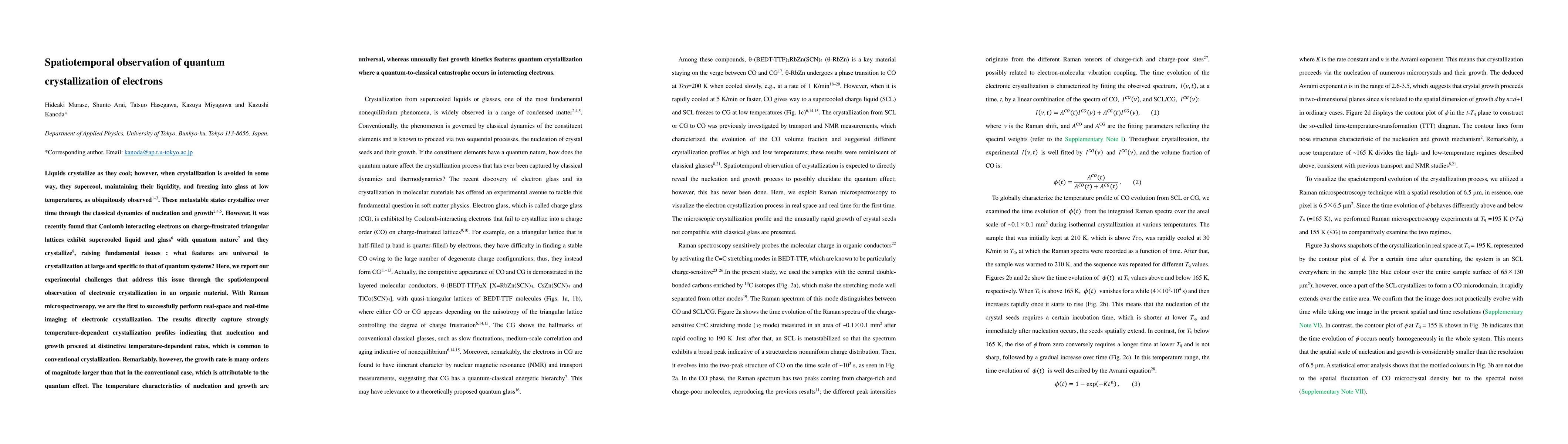 Liquids crystallize as they cool; however, when crystallization is avoided in some way, they supercool, maintaining their liquidity, and freezing into glass at low temperatures, as ubiquitously observed. These metastable states crystallize over time through the classical dynamics of nucleation and growth. However, it was recently found that Coulomb interacting electrons on charge-frustrated triangular lattices exhibit supercooled liquid and glass with quantum nature and they crystallize, raising fundamental issues : what features are universal to crystallization at large and specific to that of quantum systems? Here, we report our experimental challenges that address this issue through the spatiotemporal observation of electronic crystallization in an organic material. With Raman microspectroscopy, we are the first to successfully perform real-space and real-time imaging of electronic crystallization. The results directly capture strongly temperature-dependent crystallization profiles indicating that nucleation and growth proceed at distinctive temperature-dependent rates, which is common to conventional crystallization. Remarkably, however, the growth rate is many orders of magnitude larger than that in the conventional case, which is attributable to the quantum effect. The temperature characteristics of nucleation and growth are universal, whereas unusually fast growth kinetics features quantum crystallization where a quantum-to-classical catastrophe occurs in interacting electrons.