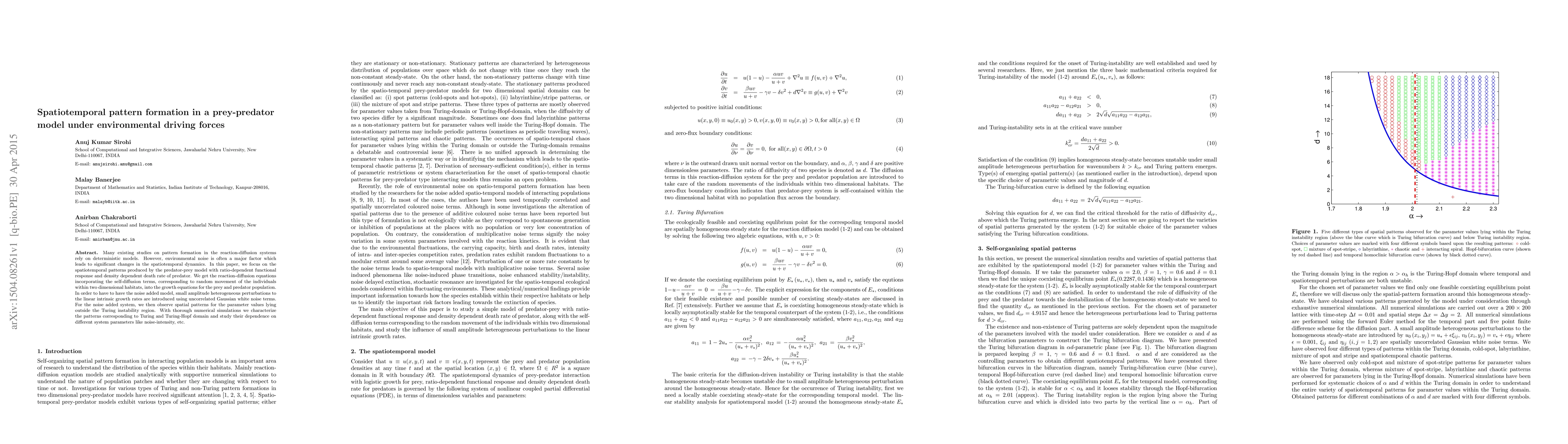 This paper investigates spatiotemporal pattern formation in a prey-predator model incorporating environmental noise, focusing on ratio-dependent functional response and density-dependent death rates. It introduces stochastic perturbations to reaction-diffusion equations and uses numerical simulations to characterize patterns outside the Turing instability region, analyzing their dependence on noise intensity and other parameters.