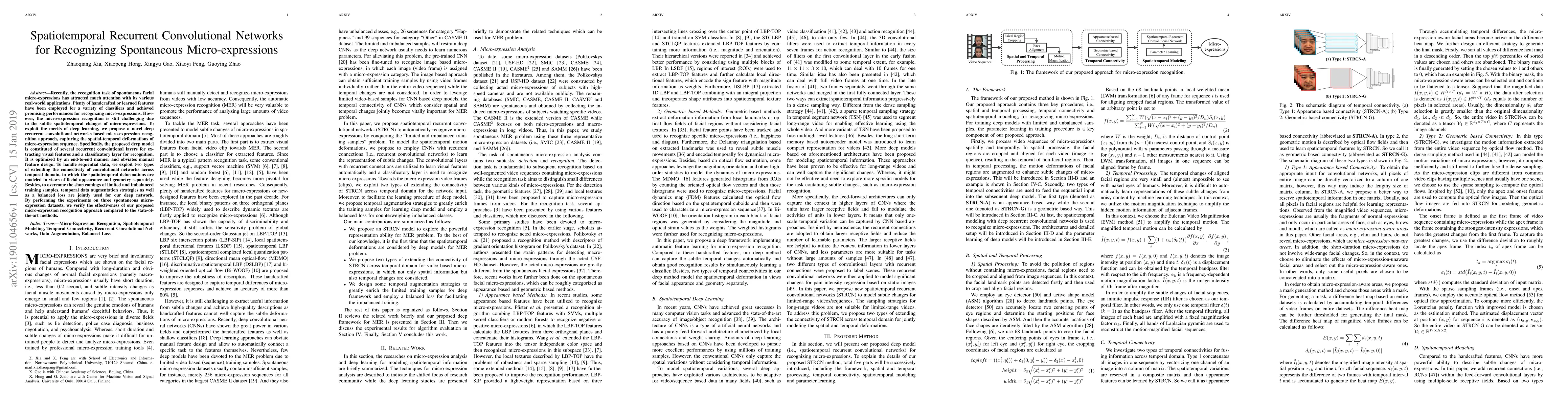 This paper proposes a novel deep recurrent convolutional network for recognizing spontaneous micro-expressions, leveraging spatial-temporal features extracted through recurrent convolutional layers and optimized end-to-end. The approach addresses challenges of limited training data with temporal augmentation and balanced loss, outperforming state-of-the-art methods on three datasets.
