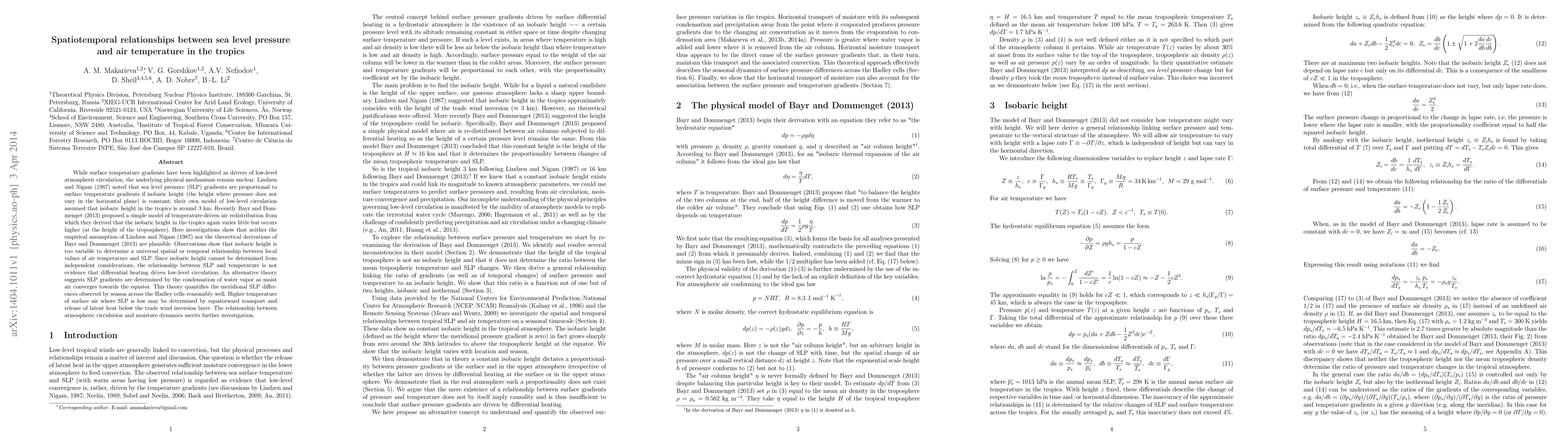 While surface temperature gradients have been highlighted as drivers of low-level atmospheric circulation, the underlying physical mechanisms remain unclear. Lindzen and Nigam (1987) noted that sea level pressure (SLP) gradients are proportional to surface temperature gradients if isobaric height (the height where pressure does not vary in the horizontal plane) is constant; their own model of low-level circulation assumed that isobaric height in the tropics is around 3 km. Recently Bayr and Dommenget (2013) proposed a simple model of temperature-driven air redistribution from which they derived that the isobaric height in the tropics again varies little but occurs higher (at the height of the troposphere). Here investigations show that neither the empirical assumption of Lindzen and Nigam (1987) nor the theoretical derivations of Bayr and Dommenget (2013) are plausible. Observations show that isobaric height is too variable to determine a universal spatial or temporal relationship between local values of air temperature and SLP. Since isobaric height cannot be determined from independent considerations, the relationship between SLP and temperature is not evidence that differential heating drives low-level circulation. An alternative theory suggests SLP gradients are determined by the condensation of water vapor as moist air converges towards the equator. This theory quantifies the meridional SLP differences observed by season across the Hadley cells reasonably well. Higher temperature of surface air where SLP is low may be determined by equatorward transport and release of latent heat below the trade wind inversion layer. The relationship between atmospheric circulation and moisture dynamics merits further investigation.