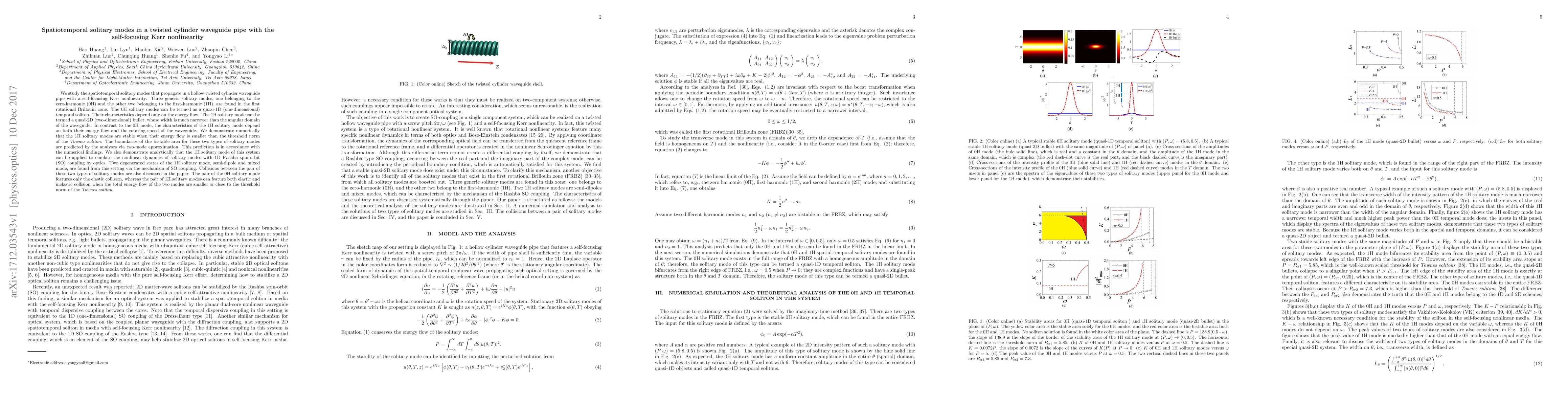 We study the spatiotemporal solitary modes that propagate in a hollow twisted cylinder waveguide pipe with a self-focusing Kerr nonlinearity. Three generic solitary modes, one belonging to the zero-harmonic (0H) and the other two belonging to the first-harmonic (1H), are found in the first rotational Brillouin zone. The 0H solitary modes can be termed as a quasi-1D (one-dimensional) temporal soliton. Their characteristics depend only on the energy flow. The 1H solitary mode can be termed a quasi-2D (two-dimensional) bullet, whose width is much narrower than the angular domain of the waveguide. In contrast to the 0H mode, the characteristics of the 1H solitary mode depend on both their energy flow and the rotating speed of the waveguide. We demonstrate numerically that the 1H solitary modes are stable when their energy flow is smaller than the threshold norm of the \emph{Townes soliton}. The boundaries of the bistable area for these two types of solitary modes are predicted by the analyses via two-mode approximation. This prediction is in accordance with the numerical findings. We also demonstrate analytically that the 1H solitary mode of this system can be applied to emulate the nonlinear dynamics of solitary modes with 1D Rashba spin-orbit (SO) coupling by optics. Two degenerated states of the 1H solitary mode, semi-dipole and mixed mode, are found from this setting via the mechanism of SO coupling. Collisions between the pair of these two types of solitary modes are also discussed in the paper. The pair of the 0H solitary mode features only the elastic collision, whereas the pair of 1H solitary modes can feature both elastic and inelastic collision when the total energy flow of the two modes are smaller or close to the threshold norm of the \emph{Townes soliton}.