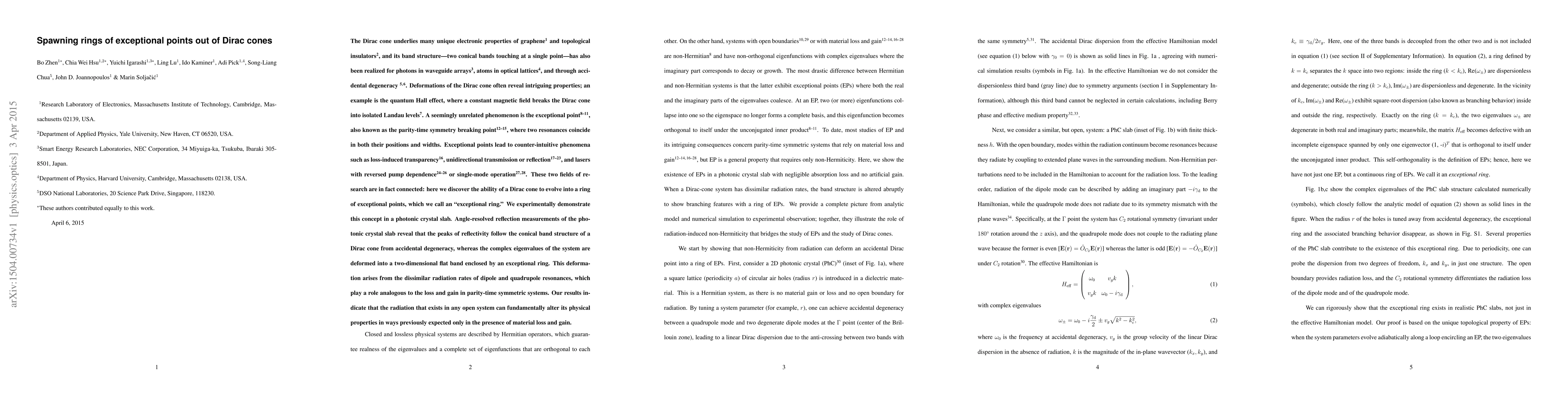The Dirac cone underlies many unique electronic properties of graphene and topological insulators, and its band structure--two conical bands touching at a single point--has also been realized for photons in waveguide arrays, atoms in optical lattices, and through accidental degeneracy. Deformations of the Dirac cone often reveal intriguing properties; an example is the quantum Hall effect, where a constant magnetic field breaks the Dirac cone into isolated Landau levels. A seemingly unrelated phenomenon is the exceptional point, also known as the parity-time symmetry breaking point, where two resonances coincide in both their positions and widths. Exceptional points lead to counter-intuitive phenomena such as loss-induced transparency, unidirectional transmission or reflection, and lasers with reversed pump dependence or single-mode operation. These two fields of research are in fact connected: here we discover the ability of a Dirac cone to evolve into a ring of exceptional points, which we call an "exceptional ring." We experimentally demonstrate this concept in a photonic crystal slab. Angle-resolved reflection measurements of the photonic crystal slab reveal that the peaks of reflectivity follow the conical band structure of a Dirac cone from accidental degeneracy, whereas the complex eigenvalues of the system are deformed into a two-dimensional flat band enclosed by an exceptional ring. This deformation arises from the dissimilar radiation rates of dipole and quadrupole resonances, which play a role analogous to the loss and gain in parity-time symmetric systems. Our results indicate that the radiation that exists in any open system can fundamentally alter its physical properties in ways previously expected only in the presence of material loss and gain.