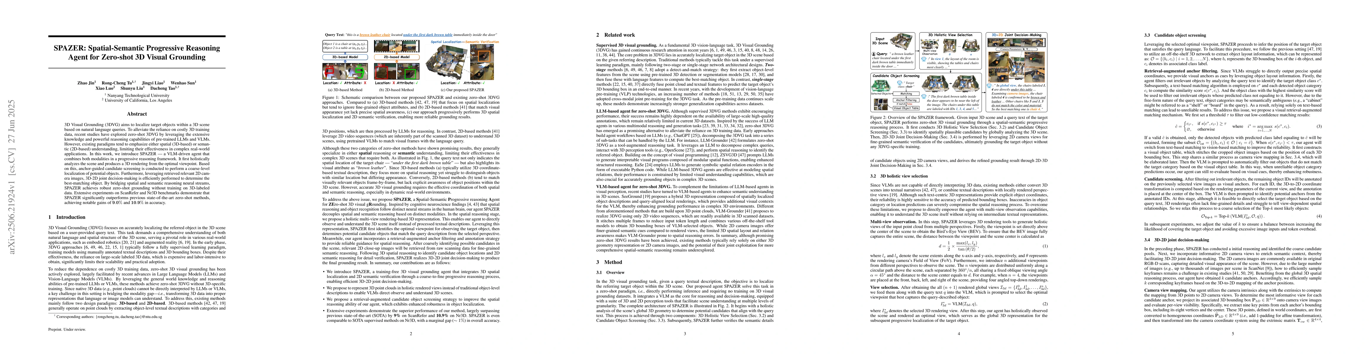 SPAZER is a VLM-driven agent that combines spatial and semantic understanding for zero-shot 3D visual grounding. It first generates a 3D scene rendering, then uses anchor-guided screening for coarse localization, and finally makes a 3D-2D joint decision to pinpoint the object, outperforming previous methods by 9.0% and 10.9% accuracy on ScanRefer and Nr3D benchmarks.