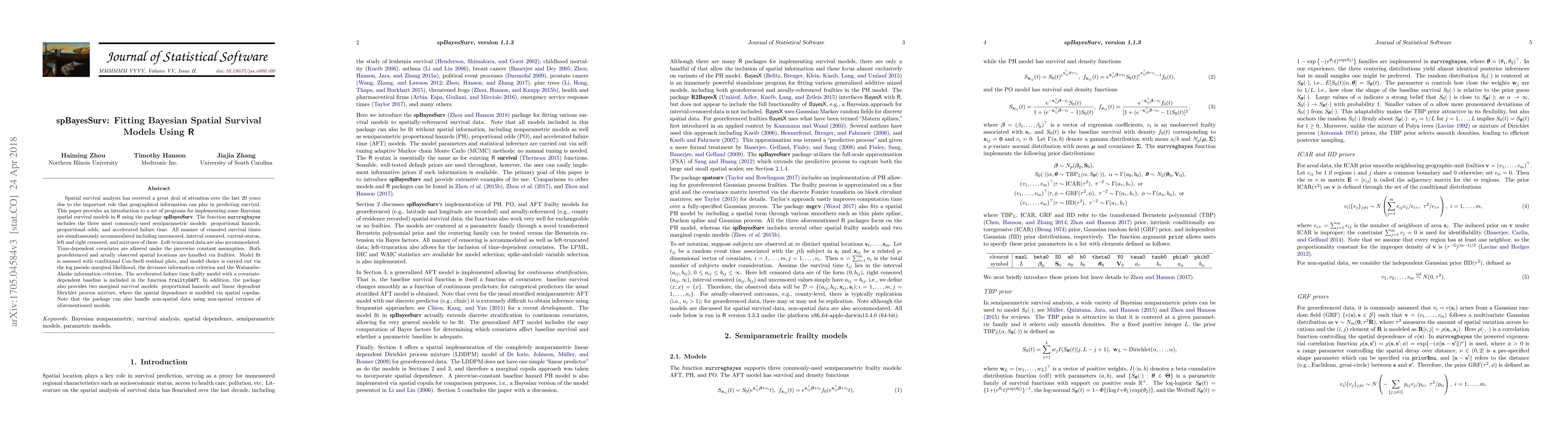 This paper introduces the spBayesSurv R package for fitting Bayesian spatial survival models, including semiparametric models like proportional hazards, proportional odds, and accelerated failure time. It accommodates various censored survival data types and handles spatial locations through frailties, with model fit and selection criteria provided.