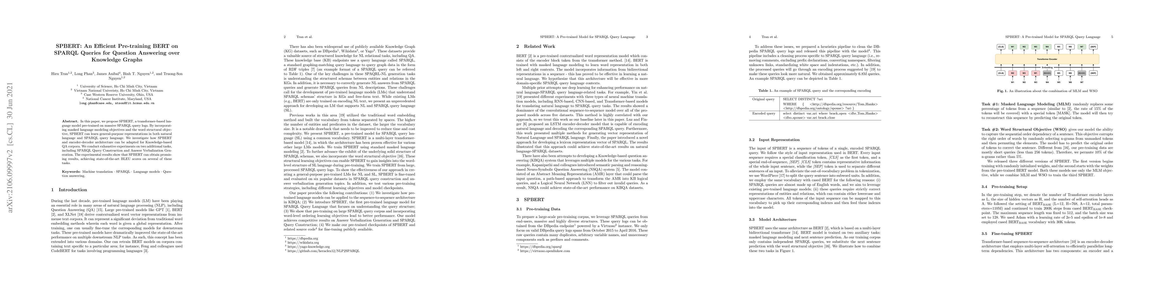 SPBERT is a transformer-based language model pre-trained on SPARQL query logs, designed to learn representations in both natural language and SPARQL. It achieves state-of-the-art BLEU scores in Knowledge-based QA, SPARQL Query Construction, and Answer Verbalization Generation.