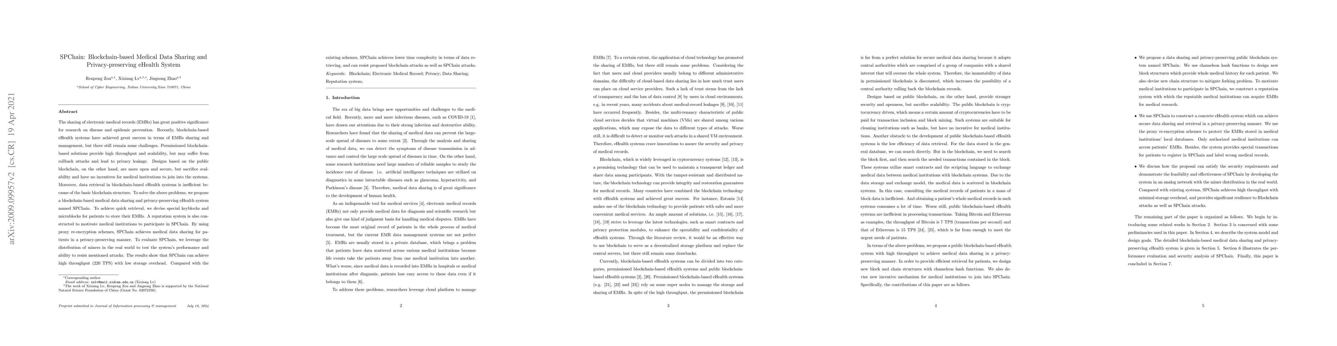 The paper proposes SPChain, a blockchain-based eHealth system designed to enhance medical data sharing and privacy protection. SPChain integrates RepuCoin with SNARKs and a novel chain structure to mitigate blockchain attacks and enhance efficiency, allowing patients to securely share their electronic medical records while maintaining control over their privacy.