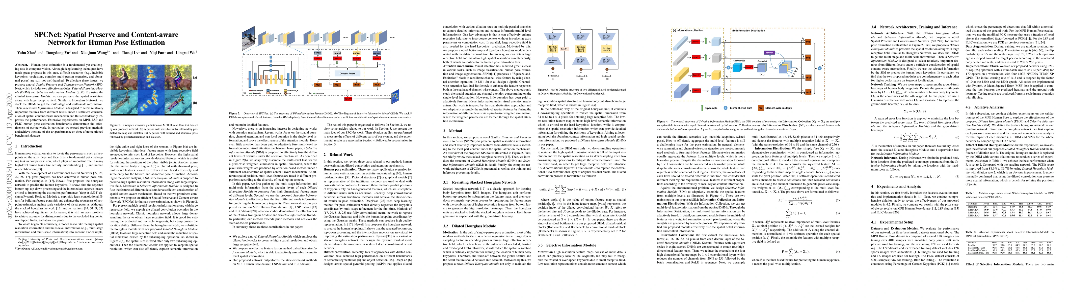 SPCNet introduces a Spatial Preserve and Content-aware Network for human pose estimation, combining Dilated Hourglass Module for spatial resolution and large receptive fields with a Selective Information Module to enhance performance in challenging scenarios like occlusions and complex multi-person settings. The method achieves state-of-the-art results on MPII, LSP, and FLIC benchmarks.