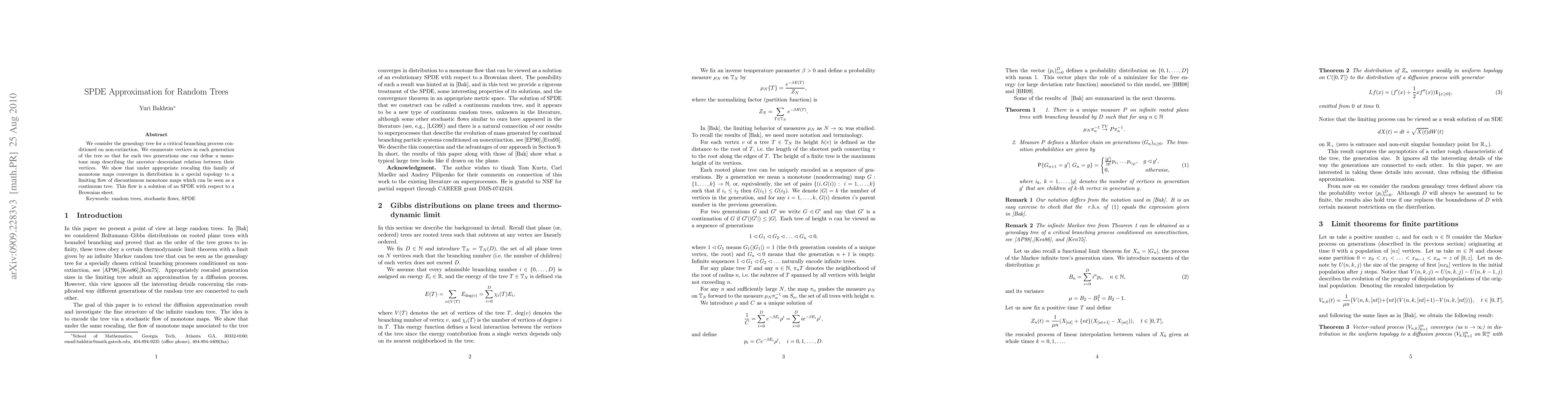 We consider the genealogy tree for a critical branching process conditioned on non-extinction. We enumerate vertices in each generation of the tree so that for each two generations one can define a monotone map describing the ancestor--descendant relation between their vertices. We show that under appropriate rescaling this family of monotone maps converges in distribution in a special topology to a limiting flow of discontinuous monotone maps which can be seen as a continuum tree. This flow is a solution of an SPDE with respect to a Brownian sheet.
