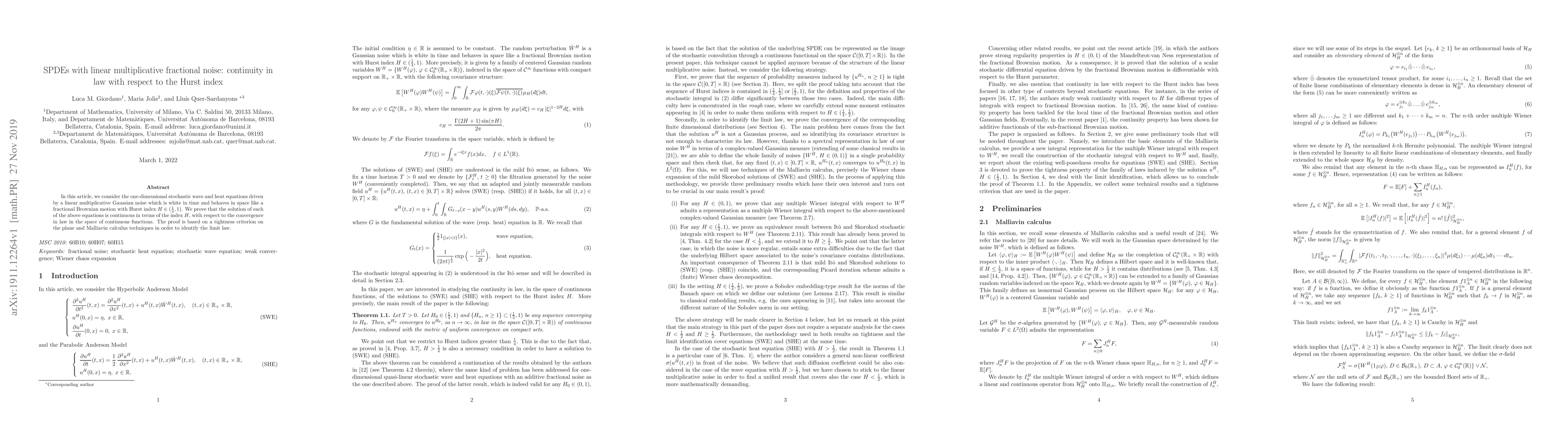 Researchers prove that solutions to stochastic wave and heat equations with linear multiplicative fractional noise exhibit continuity in law with respect to the Hurst index, demonstrating a key property of these models.