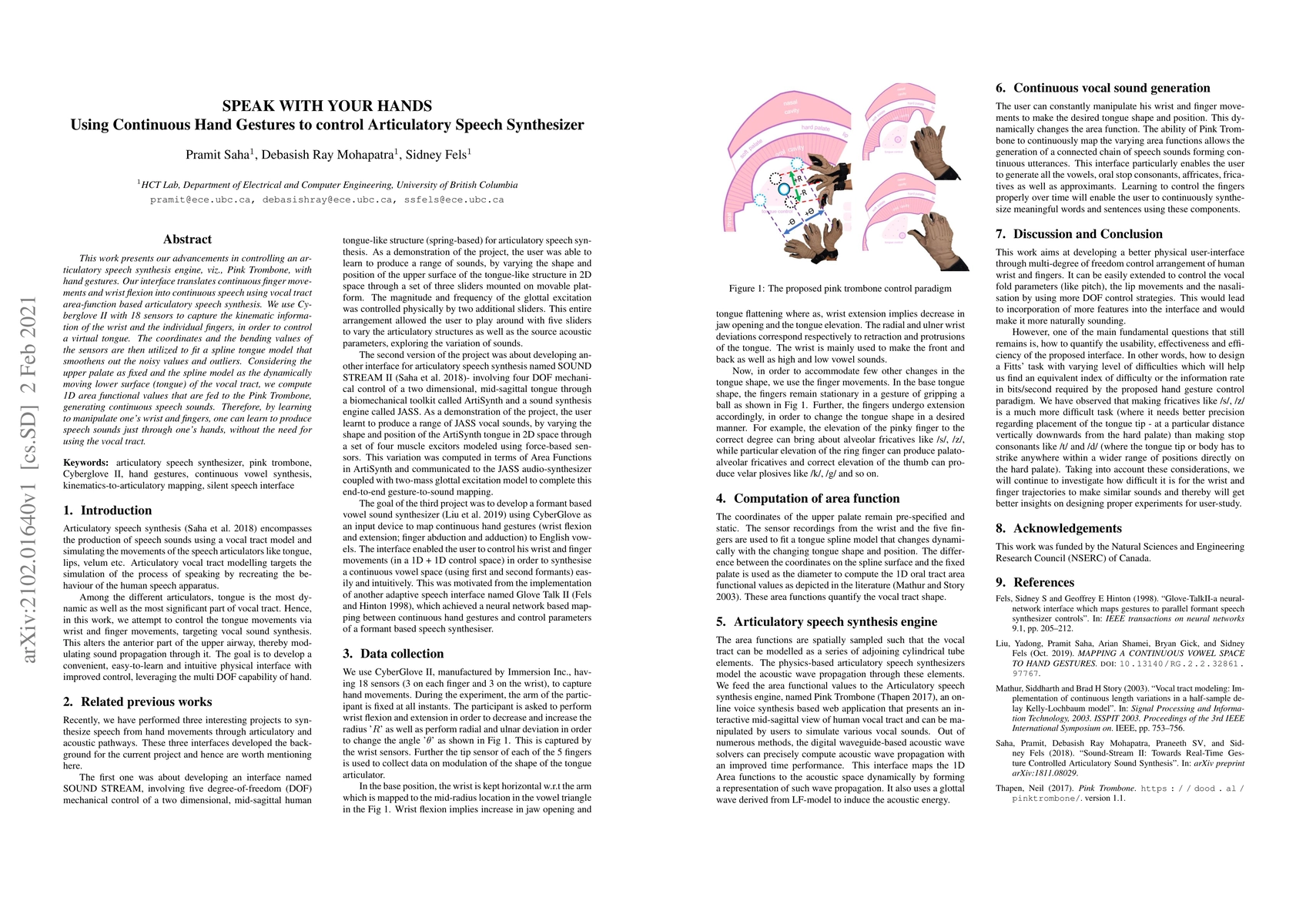 This paper details a novel interface that uses continuous hand gestures captured by a Cyberglove II to control an articulatory speech synthesizer, generating continuous speech by translating finger and wrist movements into vocal tract area-function values. The system employs a spline tongue model to smoothen sensor data and computes 1D area functional values for the Pink Trombone synthesizer.