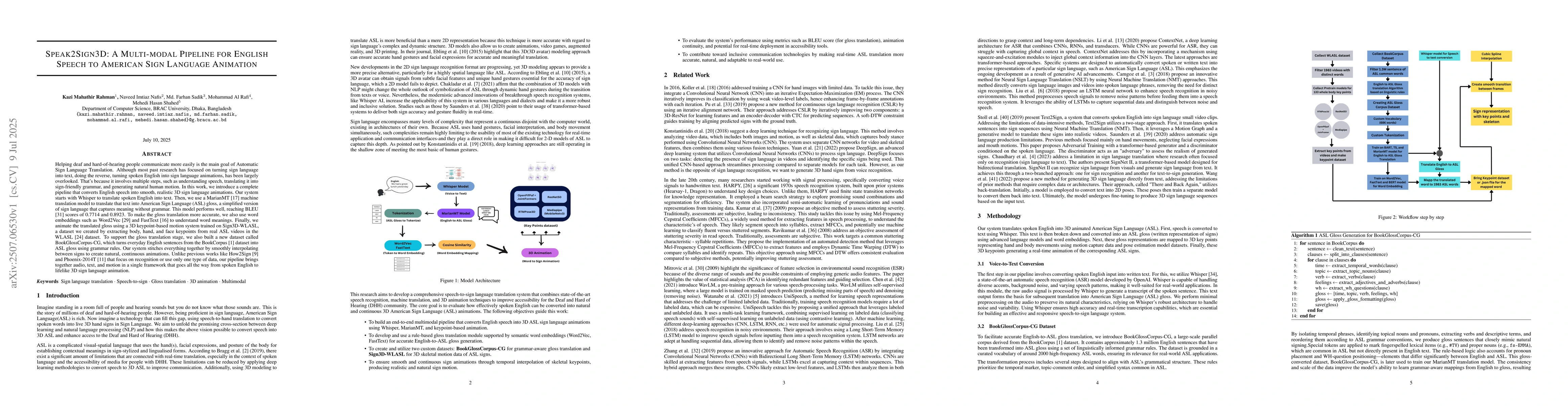 The research introduces a multi-modal pipeline, Speak2Sign3D, that converts English speech into 3D American Sign Language (ASL) animations. It involves converting speech to text using Whisper, translating text to ASL gloss using advanced language models and word embeddings, mapping gloss to 3D keypoints using motion capture data, and generating real-time 3D sign language animations.