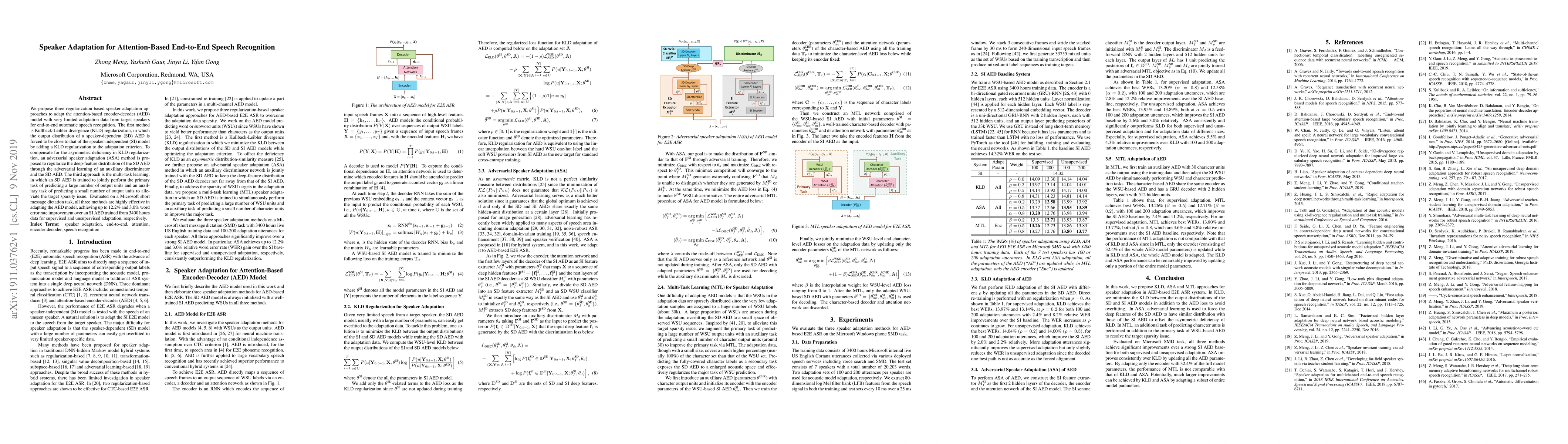 This paper proposes three regularization-based speaker adaptation methods to enhance the performance of an attention-based encoder-decoder model for end-to-end speech recognition with limited adaptation data. The methods include KLD regularization, adversarial speaker adaptation, and multi-task learning, all achieving significant improvements in word error rates.