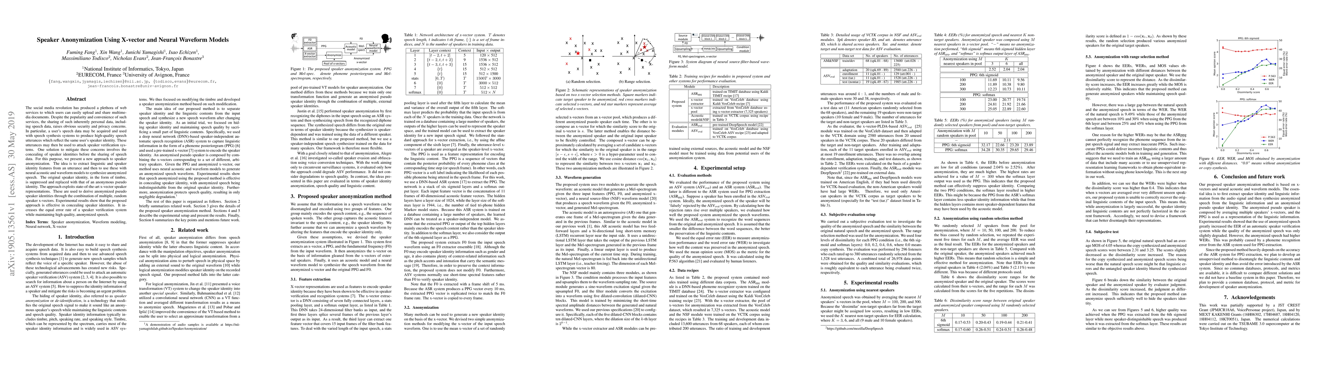 This paper proposes a new method for speaker anonymization using x-vector representations and neural waveform models to conceal speaker identity in speech data. The approach effectively increases the error rate of speaker verification systems while maintaining high-quality anonymized speech.