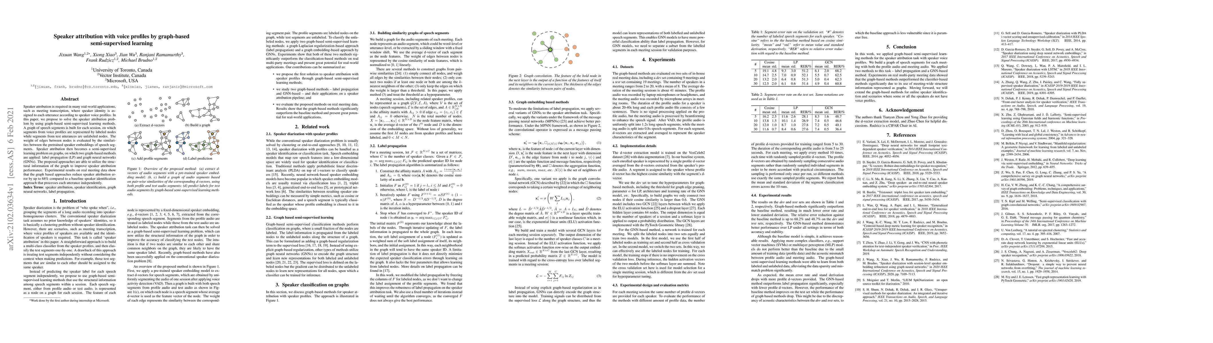 This paper proposes graph-based semi-supervised learning methods for speaker attribution in meeting transcription, utilizing labeled voice profiles and unlabeled test utterances to improve accuracy. Experimental results show a significant reduction in attribution error compared to independent utterance processing baselines.
