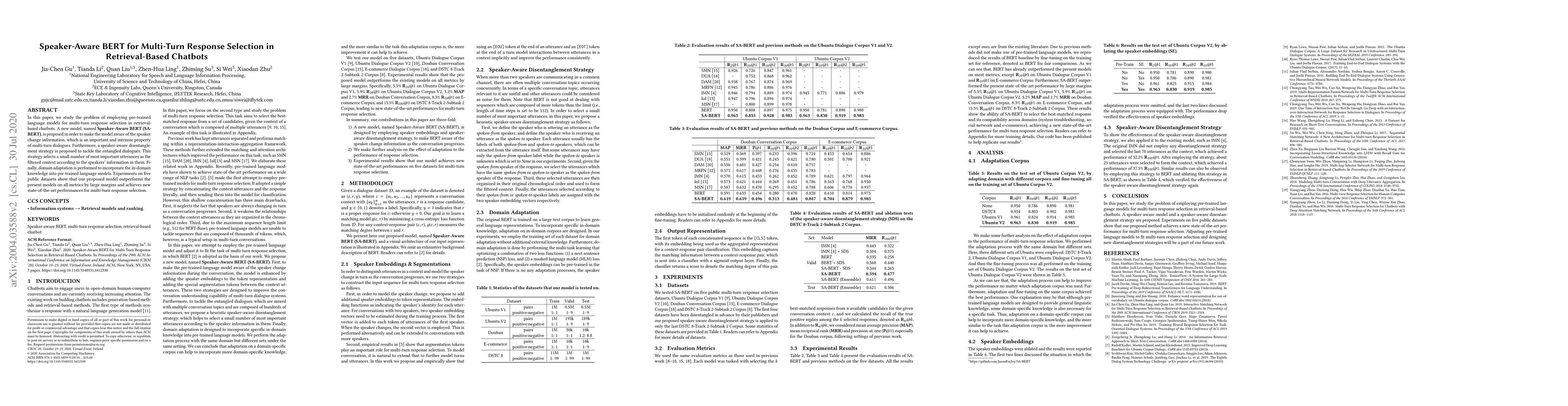 This paper proposes Speaker-Aware BERT (SA-BERT) to enhance multi-turn response selection in retrieval-based chatbots by incorporating speaker change information and employing a disentanglement strategy to filter important utterances. The model achieves state-of-the-art performance on five datasets, outperforming existing models significantly.