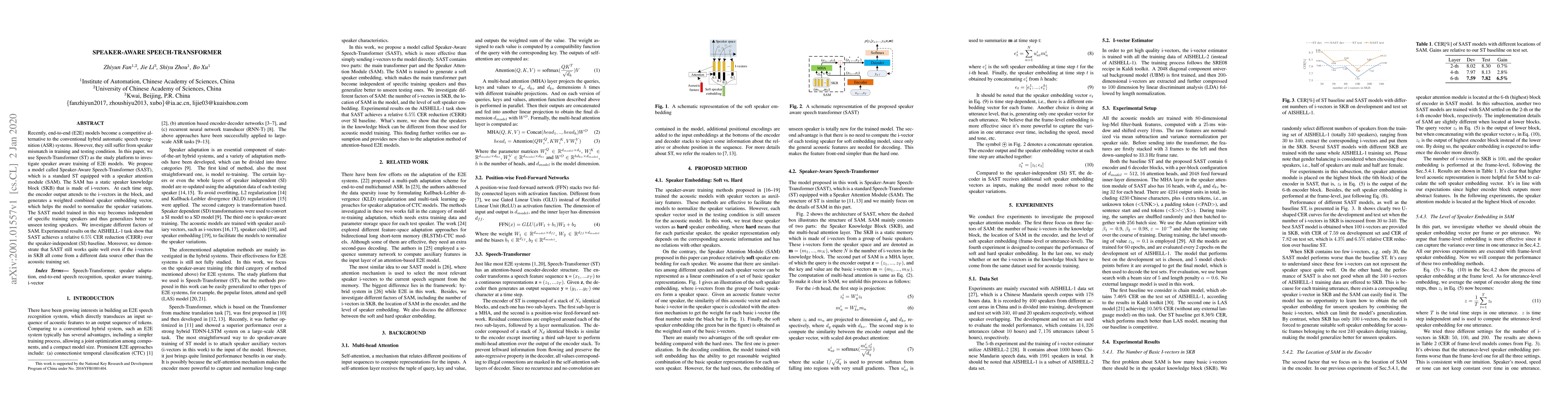 A new model called Speaker-Aware Speech-Transformer (SAST) is proposed to improve the performance of end-to-end speech recognition models by incorporating a speaker attention module that normalizes speaker variations. The model achieves a 6.5% relative CER reduction over a baseline model.
