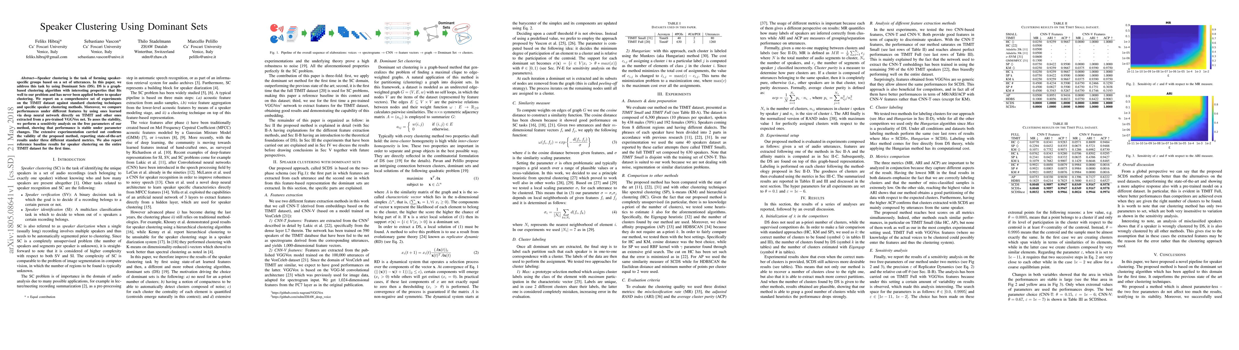 Speaker clustering is the task of forming speaker-specific groups based on a set of utterances. In this paper, we address this task by using Dominant Sets (DS). DS is a graph-based clustering algorithm with interesting properties that fits well to our problem and has never been applied before to speaker clustering. We report on a comprehensive set of experiments on the TIMIT dataset against standard clustering techniques and specific speaker clustering methods. Moreover, we compare performances under different features by using ones learned via deep neural network directly on TIMIT and other ones extracted from a pre-trained VGGVox net. To asses the stability, we perform a sensitivity analysis on the free parameters of our method, showing that performance is stable under parameter changes. The extensive experimentation carried out confirms the validity of the proposed method, reporting state-of-the-art results under three different standard metrics. We also report reference baseline results for speaker clustering on the entire TIMIT dataset for the first time.