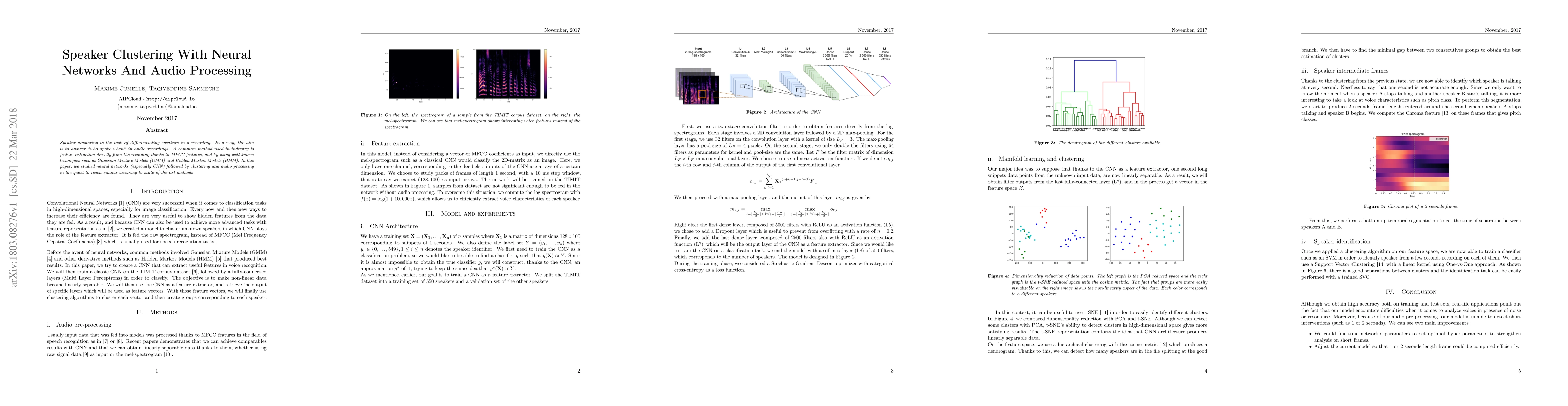 Speaker clustering is the task of differentiating speakers in a recording. In a way, the aim is to answer "who spoke when" in audio recordings. A common method used in industry is feature extraction directly from the recording thanks to MFCC features, and by using well-known techniques such as Gaussian Mixture Models (GMM) and Hidden Markov Models (HMM). In this paper, we studied neural networks (especially CNN) followed by clustering and audio processing in the quest to reach similar accuracy to state-of-the-art methods.
